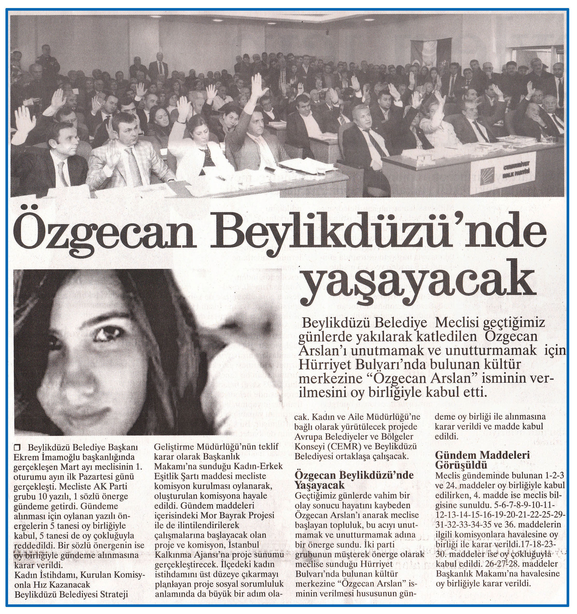 3 Mart 2015 tarihli ''FARK GAZETESİ'' gazetesi. Beylikdüzü Belediye Meclisi geçtiğimiz günlerde yakılarak katledilen Özgecan Arslan'ı unutmamak ve unutturmamak için Hürriyet Bulvarı'nda bulunan kültür merkezine ''Özgecan Arslan'' isminin verilmesini oy birliğiyle kabul etti.