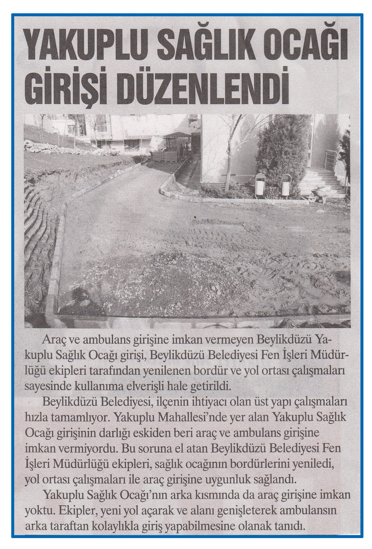 4 Mart 2015 tarihli ''HABERCİ'' gazetesi. Araç ve ambulans girişine imkan vermeyen Beylikdüzü Yakuplu Sağlık Ocağı girişi,Beylikdüzü Belediyesi Fen İşleri Müdürlüğü ekipleri tarafından yenilenen bordür ve yol ortası çalışmaları sayesinde kullanıma elverişli hale getirildi.