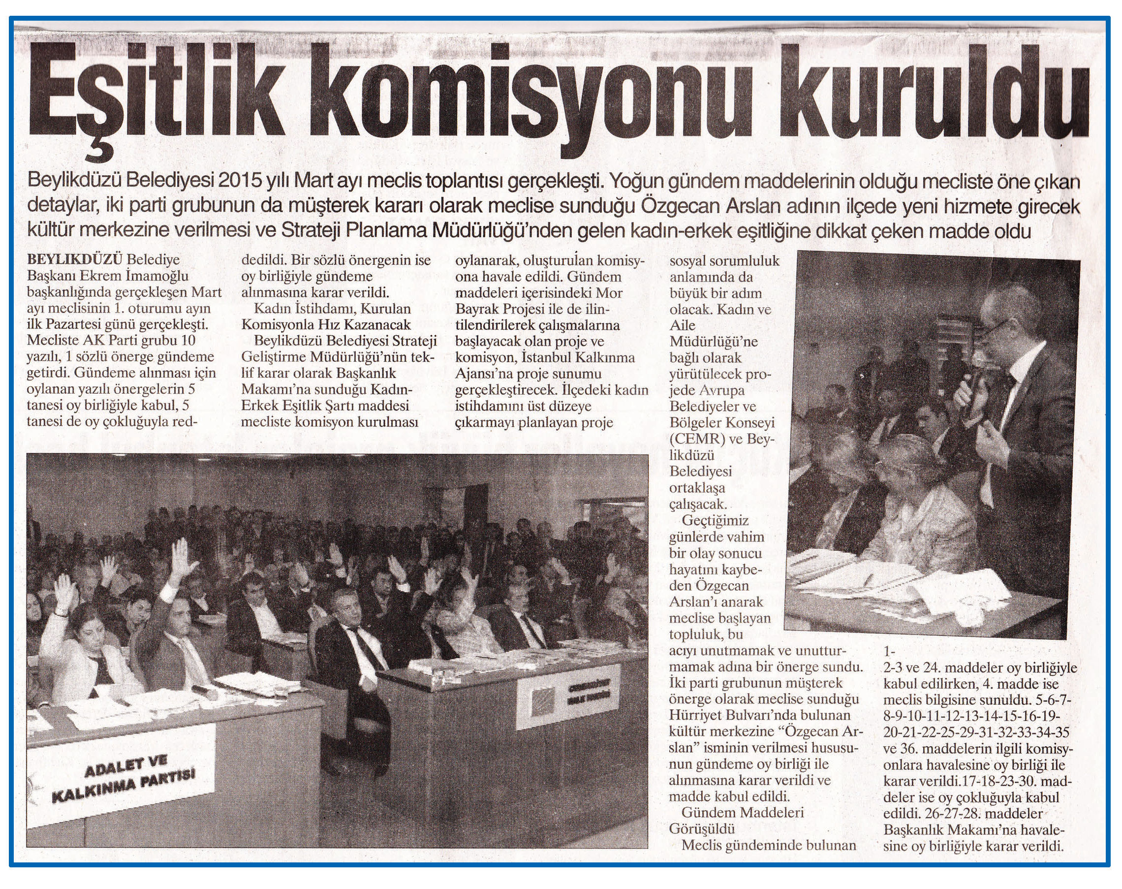 4 Mart 2015 tarihli ''MANŞET'' gazetesi. Beylikdüzü Belediyesi 2015 yılı Mart ayı meclis toplantısı gerçekleşti. Yoğun gündem maddelerinin olduğu mecliste öne çıkan detaylar,iki parti grubunun da müşterek kararı olarak meclise sunduğu Özgecan Arslan adının ilçede yeni hizmete girecek kültür merkezine verilmesi ve Strateji Planlama Müdürlüğü'nden gelen kadın-erkek eşitliğine dikkat çeken madde oldu.