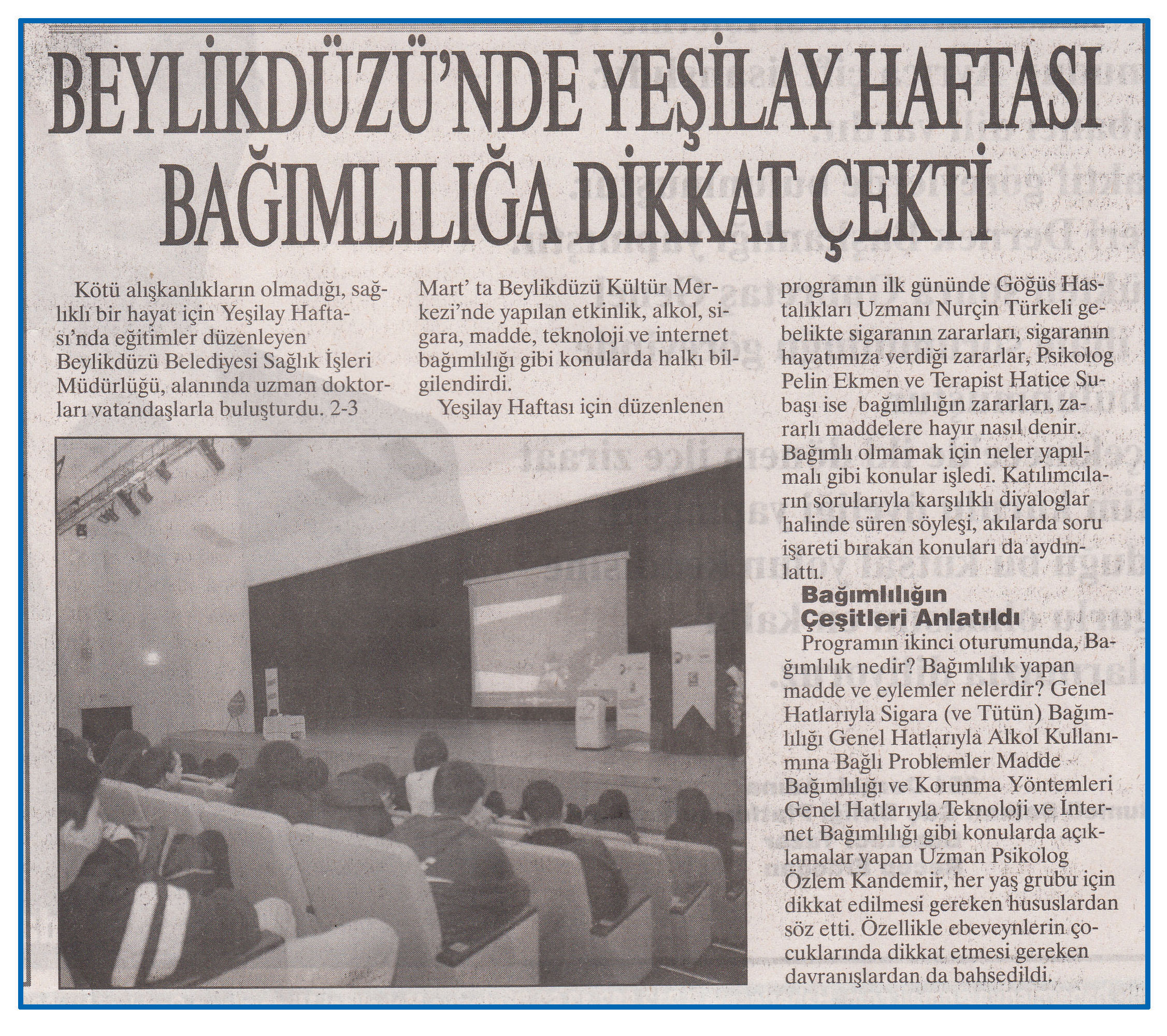 5 Mart 2015 tarihli ''BÜYÜKÇEKMECE'' gazetesi. Kötü alışkanlıkların olmadığı, sağlıklı bir hayat için Yeşilay Haftası'nda eğitimler düzenleyen Beylikdüzü Belediyesi Sağlık İşleri Müdürlüğü,alanında uzman doktorları vatandaşlarla buluşturdu.
