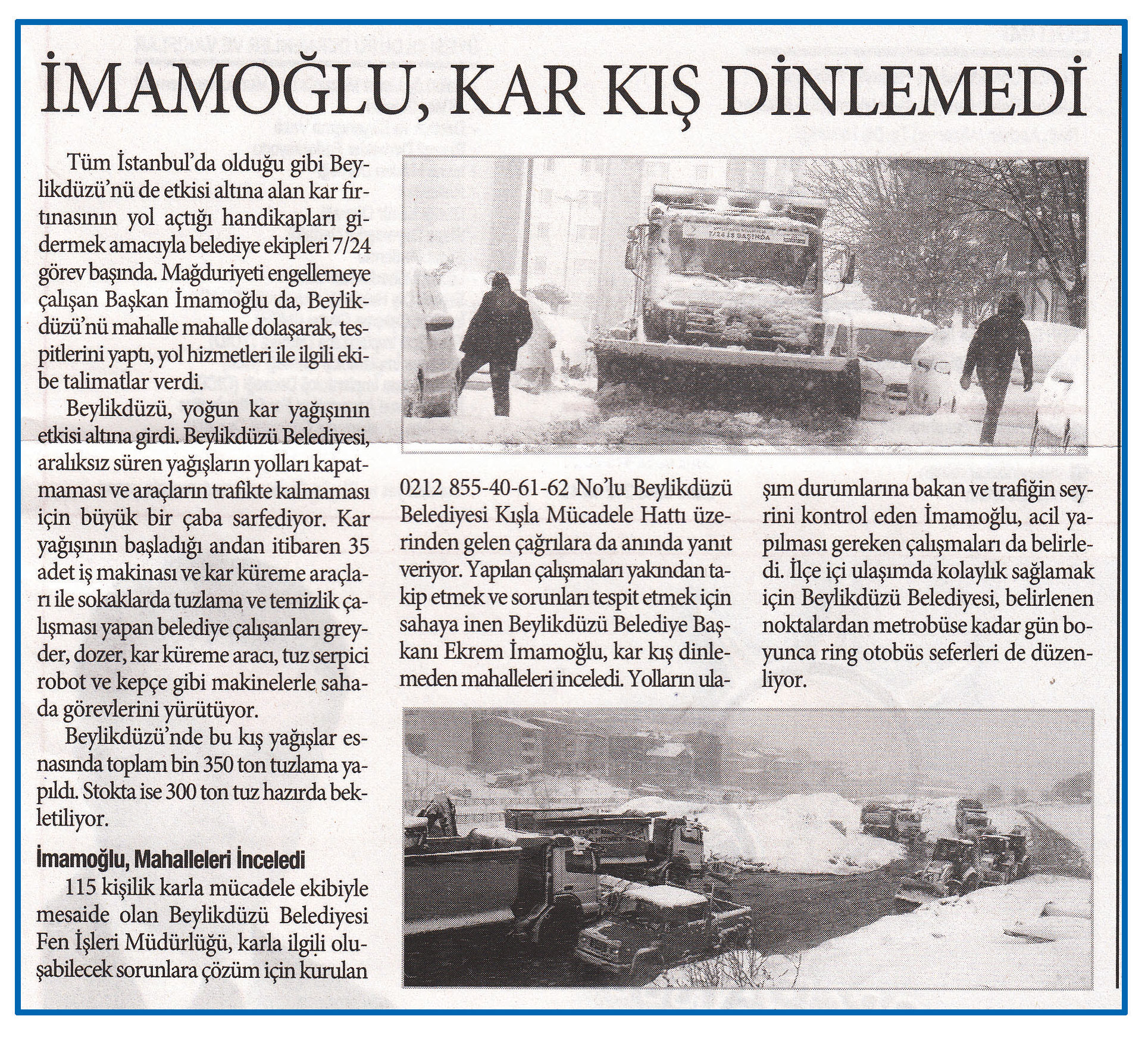 5 Mart 2015 tarihli ''YEREL MEDYA'' gazetesi. Tüm İstanbul'da olduğu gibi Beylikdüzü'nü etkisi altına alan kar fırtınasının yol açtığı handikapları gidermek amacıyla belediye ekipleri 7/24 görev başında,Mağduriyeti engellemeye çalışan Başkan İmamoğlu da,Beylikdüzü'nü mahalle mahalle dolaşarak,tespitlerini yaptı,yol hizmetleri ile ilgili ekibe talimatlar verdi.