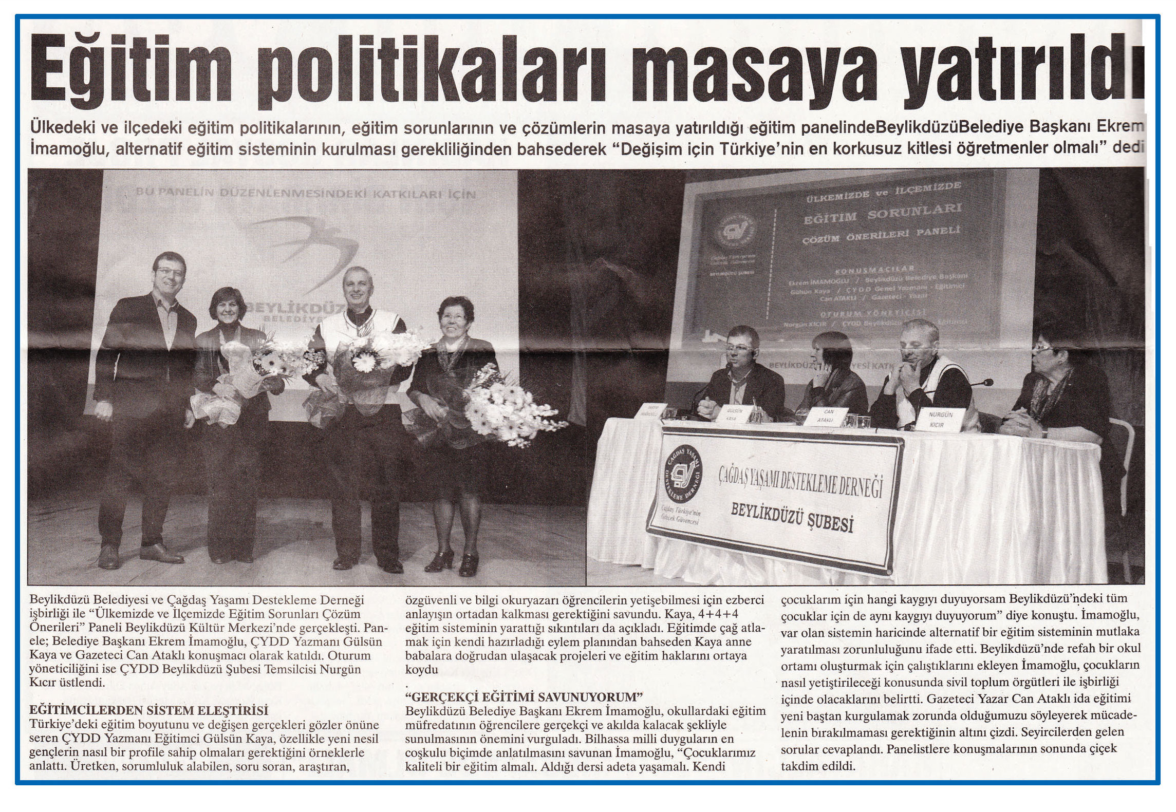 6 Mart 2015 tarihli ''YENİ GÜN'' gazetesi. Ülkedeki ve ilçedeki eğitim politikalarının,eğitim sorunlarının ve çözümlerin masaya yatırıldığı eğitim panelinde Beylikdüzü Belediye Başkanı Ekrem İmamoğlu,alternatif eğitim sisteminin kurulması gerektiğinden bahsederek ''Değişim için Türkiye'nin en korkusuz kitlesi öğretmenler olmalı'' dedi.
