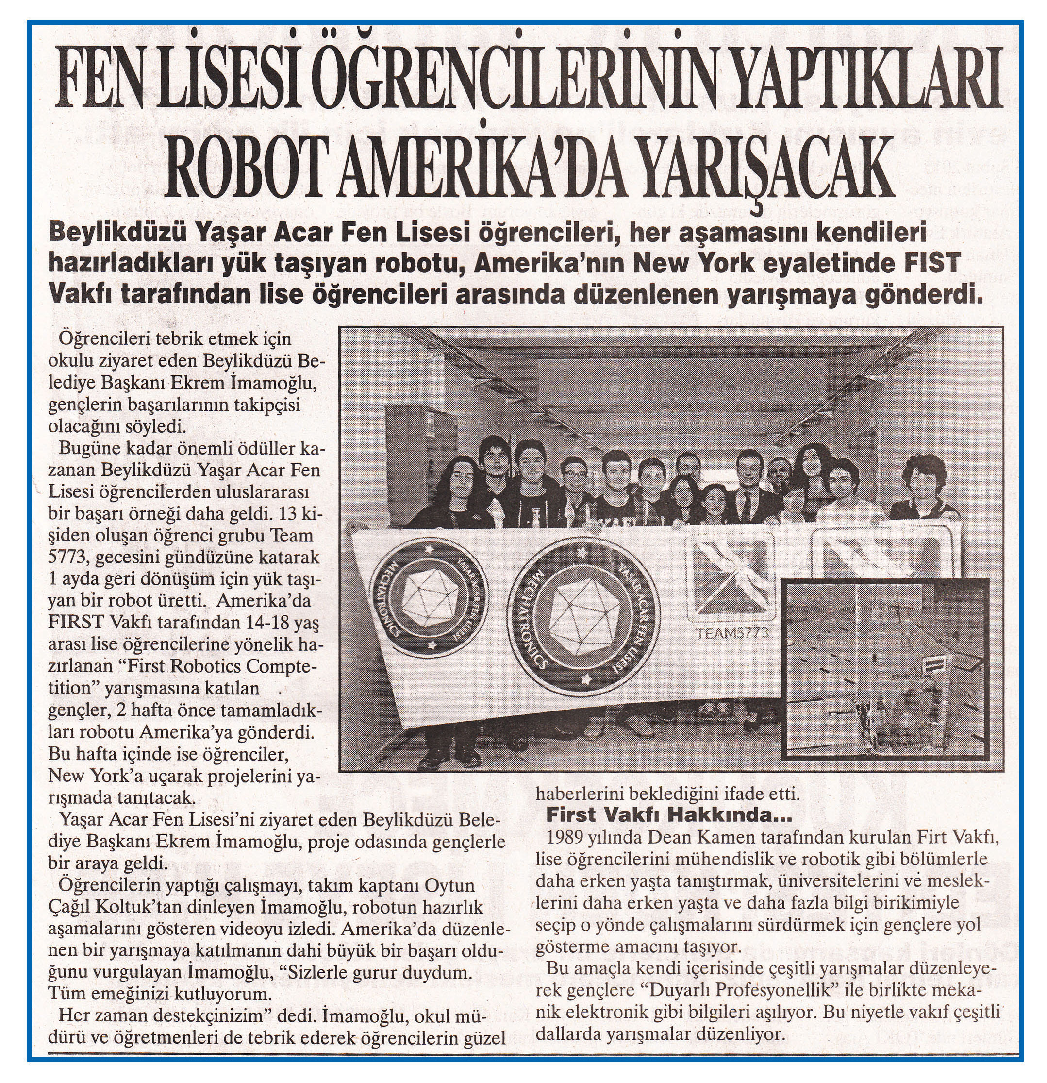 9 Mart 2015 tarihli ''YURT HABER'' gazetesi. Beylikdüzü Yaşar Acar Fen Lisesi öğrencileri,her aşamasını kendileri hazırladıkları yük taşıyan robotu,Amerika'nın New York eyaletinde FIST Vakfı tarafından lise öğrencileri arasında düzenlenen yarışmaya gönderdi.