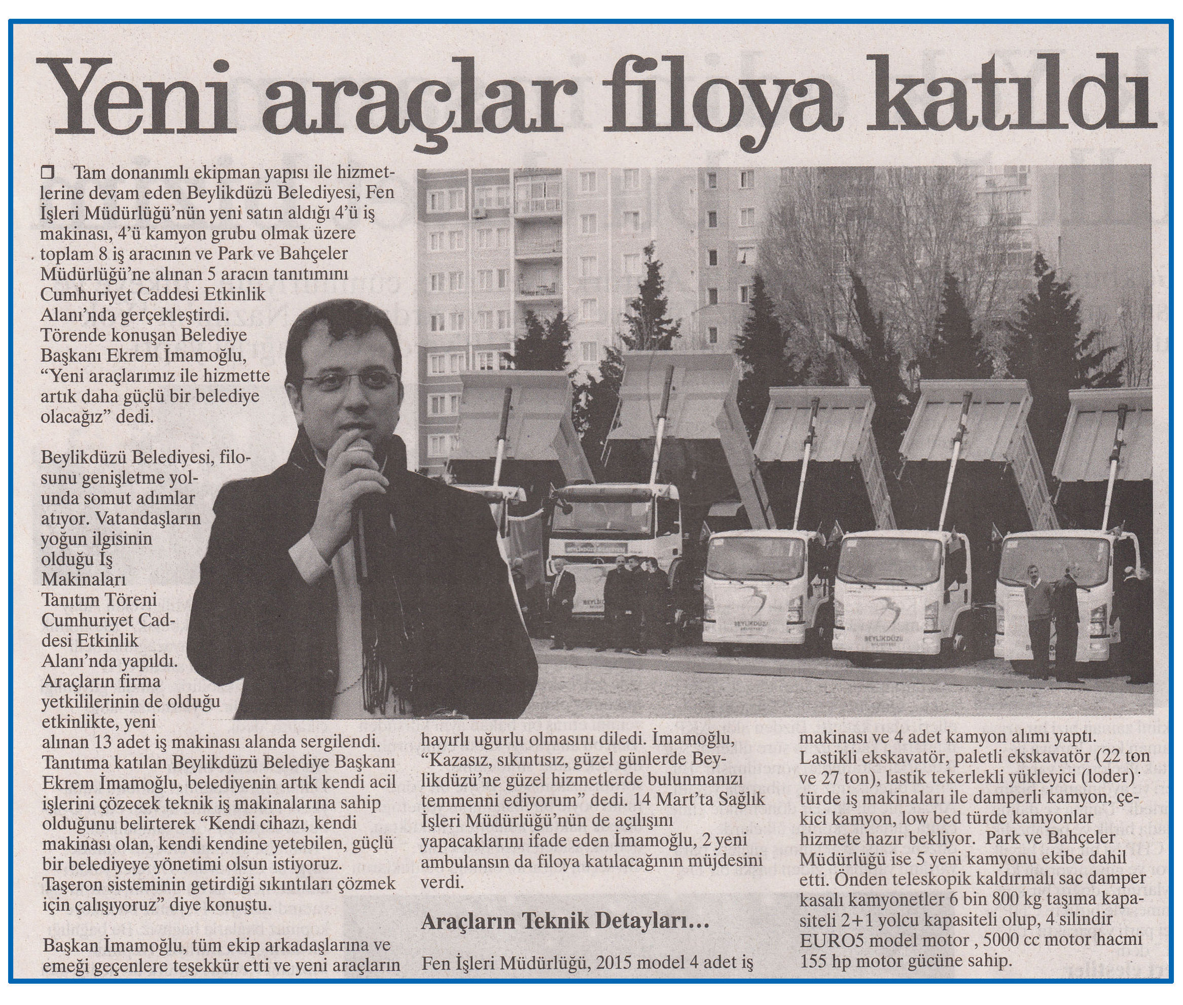 9 Mart 2015 tarihli ''FARK GAZETESİ'' gazetesi. Tam donanımlı ekipman yapısı ile hizmetlerine devam eden Beylikdüzü Belediyesi,Fen İşleri Müdürlüğü'nün yeni satın aldığı 4'ü iş makinası, 4'ü kamyon grubu olmak üzere toplam 8 iş aracının ve Park ve Bahçeler Müdürlüğü'ne alınan 5 aracın tanıtımını Cumhuriyet Caddesi Etkinlik Alanı'nda gerçekleştirdi.