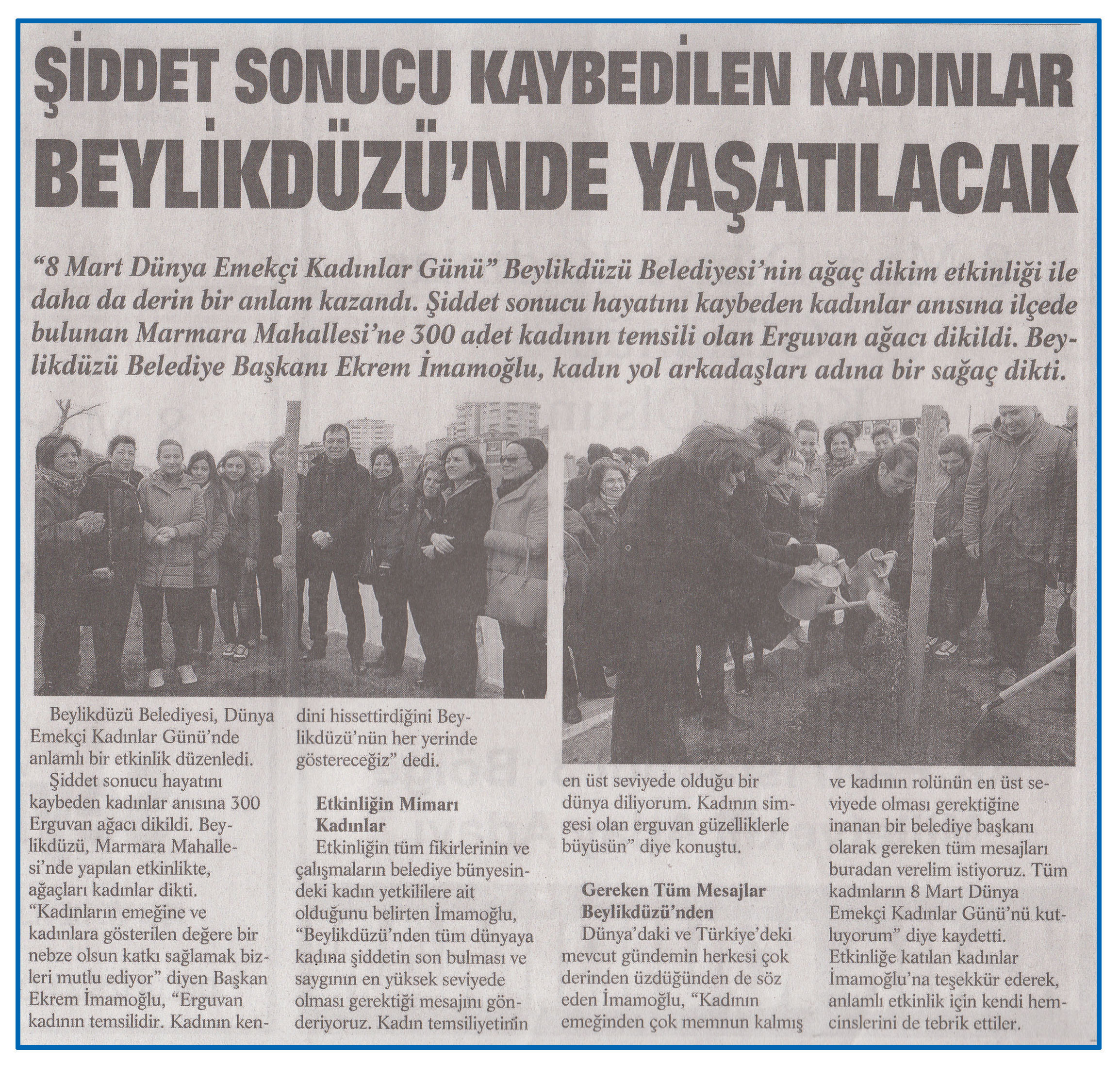 10 Mart 2015 tarihli ''YENİ UMUT'' gazetesi. ''8 Mart Dünya Emekçi Kadınlar Günü'' Beylikdüzü Belediyesi'nin ağaç dikim etkinliği ile daha da derin bir anlam kazandı. Şiddet sonucu hayatını kaybeden kadınlar anısına ilçede bulunan Marmara Mahallesi'ne 300 adet kadının temsili olan Erguvan ağacı dikildi.Beylikdüzü Belediye Başkanı Ekrem İmamoğlu,kadın yol arkadaşları adına bir ağaç dikti.