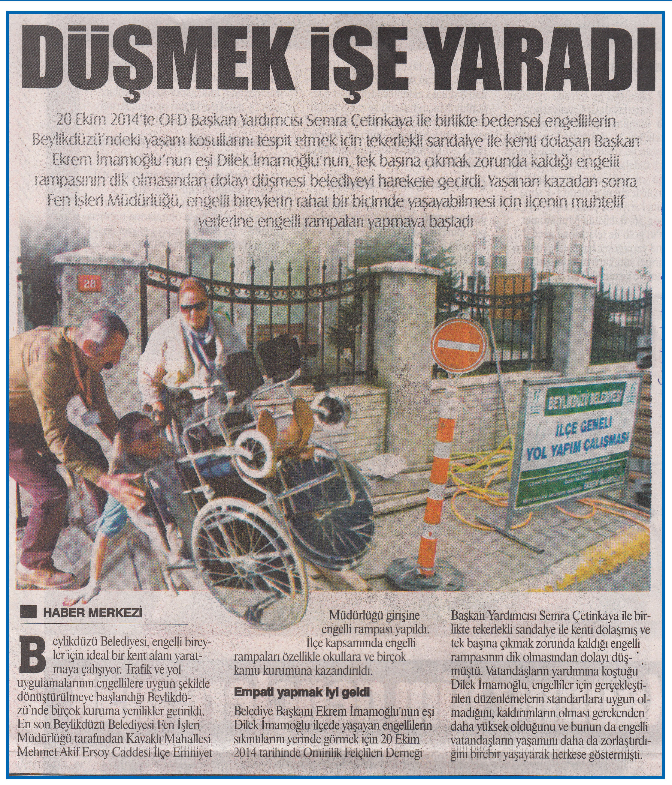 13 Mart 2015 tarihli ''GAZETE İSTANBUL'' gazetesi. 20 Ekim 2014'te OFD Başkan Yardımcısı Semra Çetinkaya ile birlikte bedensel engellilerin Beylikdüzü'ndeki yaşam koşullarını tespit etmek için tekerlekli sandalye ile kenti dolaşan Başkan Ekrem İmamoğlu'nun eşi Dilek İmamoğlu'nun tek başına çıkmak zorunda kaldığı engelli rampasının dik olmasından dolayı düşmesi belediyeyi harekete geçirdi.