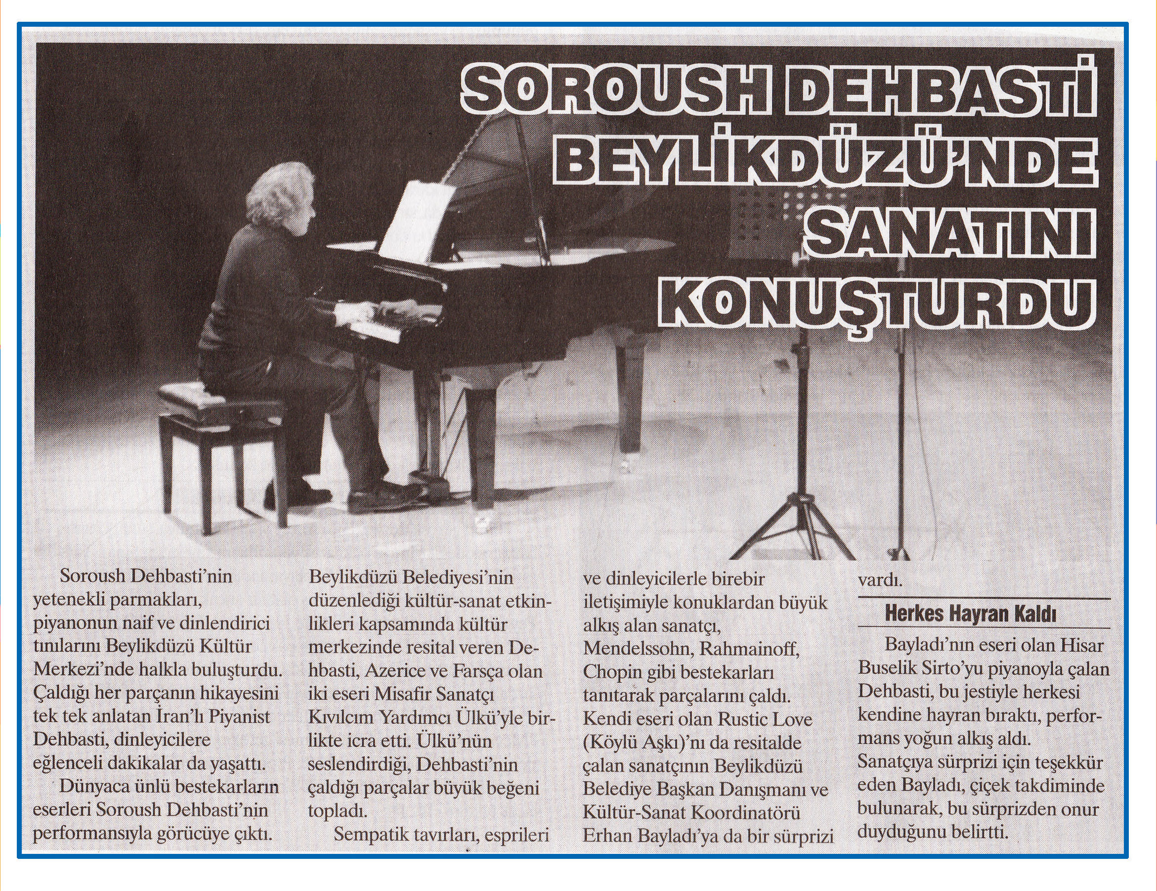 13 Mart 2015 tarihli ''HABER EKSPRESS'' gazetesi. Soroush Dehbasti'nin yetenekli parmakları,piyanonun naif ve dinlendirici tınılarını Beylikdüzü Kültür Merkezi'nde halkla buluşturdu.