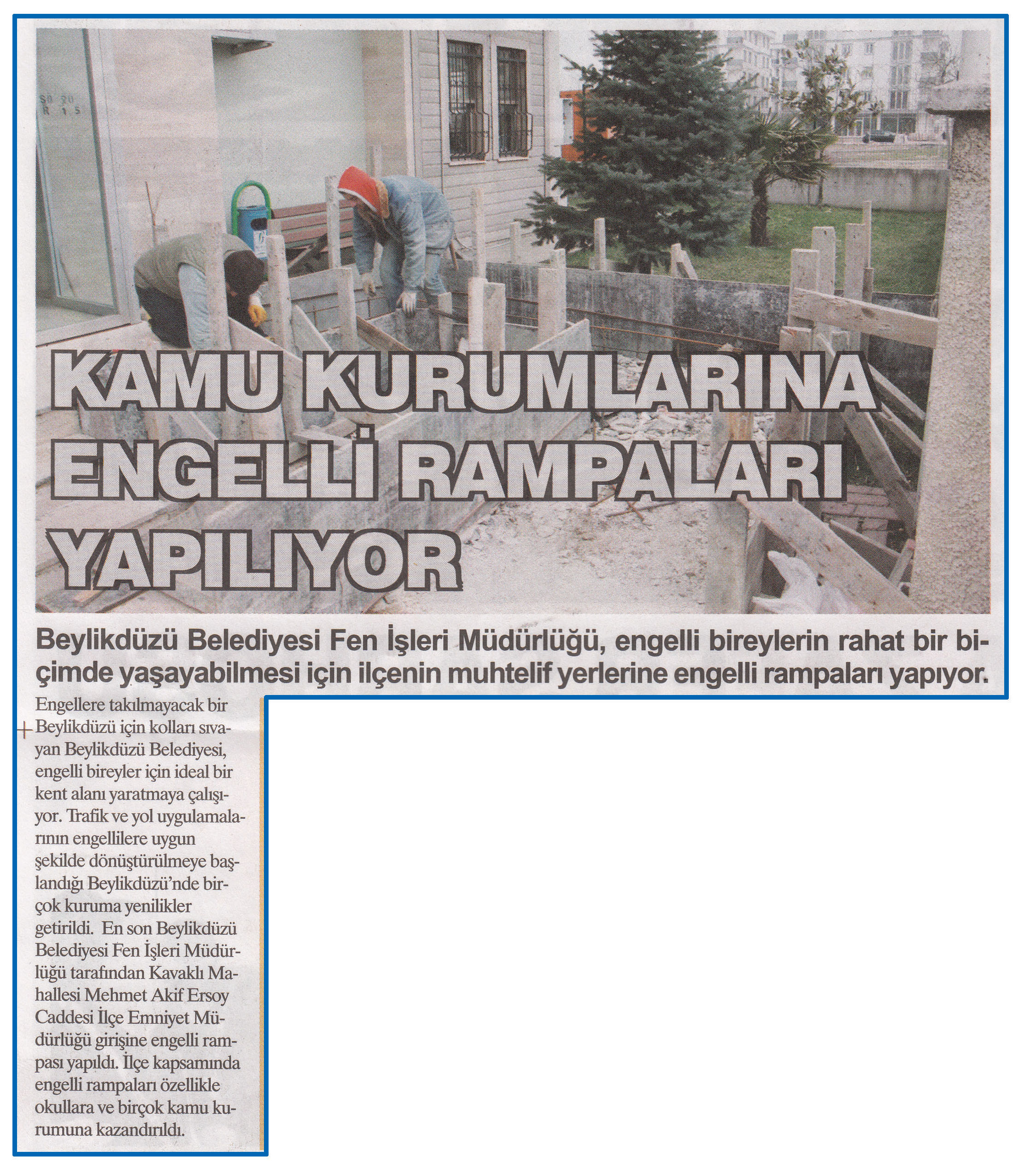13 Mart 2015 tarihli ''HABER EKSPRESS'' gazetesi.Beylikdüzü Belediyesi Fen İşleri Müdürlüğü,engelli bireylerin rahat bir biçimde yaşayabilmesi için ilçenin muhtelif yerlerine engelli rampaları yapıyor.