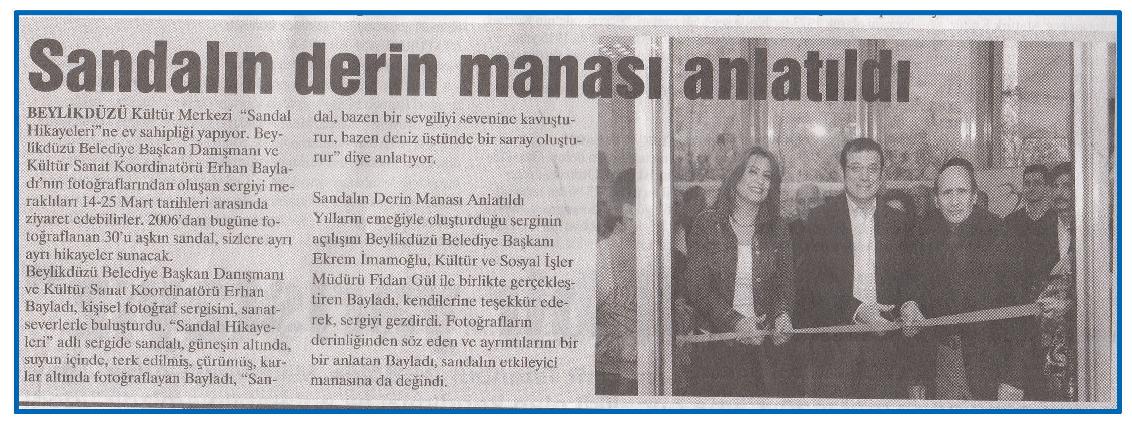 19 Mart 2015 tarihli ''YENİ GÜN'' gazetesi. Beylikdüzü Kültür Merkezi ''Sandal Hikayeleri''ne ev sahipliği yapıyor.Beylikdüzü Belediye Başkan Danışmanı ve Kültür Sanat Koordinatörü Erhan Bayladı'nın fotoğraflarından oluşan sergiye meraklıları 14-25 Mart tarihleri arasında ziyaret edebilirler.