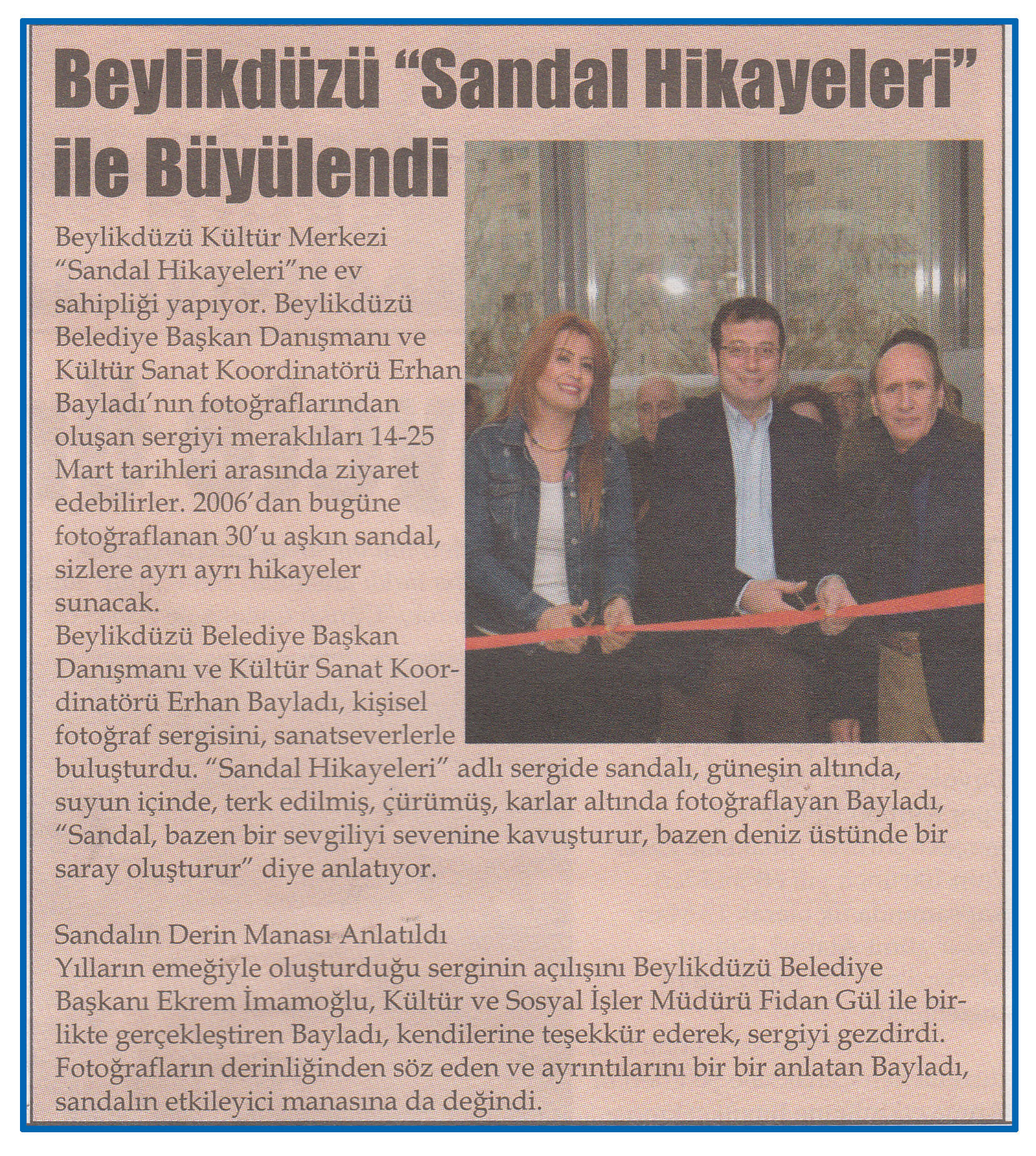 20 Mart 2015 tarihli ''BEYLİKDÜZÜ'' gazetesi. Beylikdüzü Kültür Merkezi ''Sandal Hikayeleri''ne ev sahipliği yapıyor.Beylikdüzü Belediye Başkan Danışmanı ve Kültür Sanat Koordinatörü Erhan Bayladı'nın fotoğraflarından oluşan sergiyi meraklıları 14-25 Mart tarihleri arasında ziyaret edilebilir.