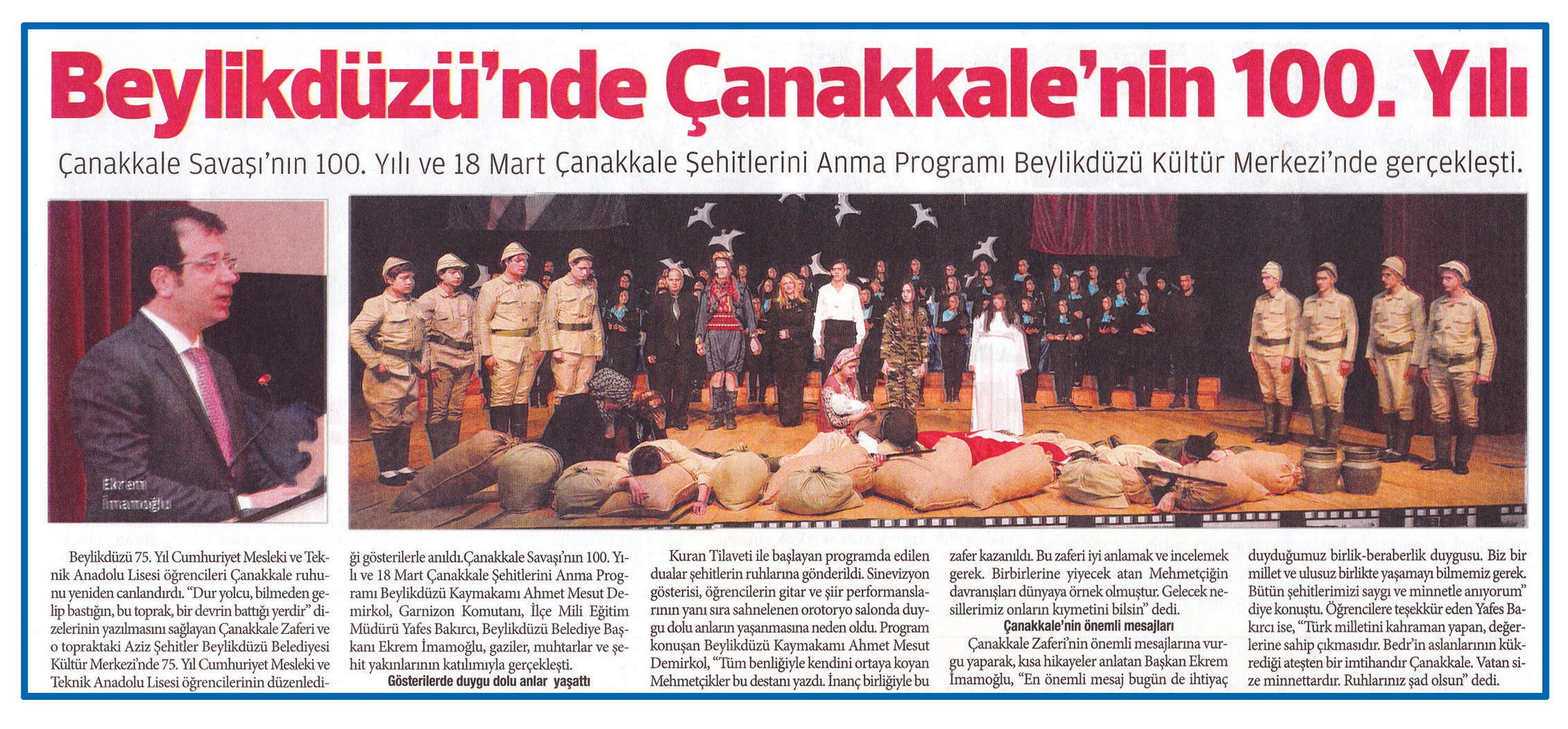 24 Mart 2015 tarihli ''BİZİMYAŞAM'' gazetesi. Çanakkale Savaşı'nın 100. Yılı ve 18 Mart Çanakkale Şehitlerini Anma Programı Beylikdüzü Kültür Merkezi'nde gerçekleşti.