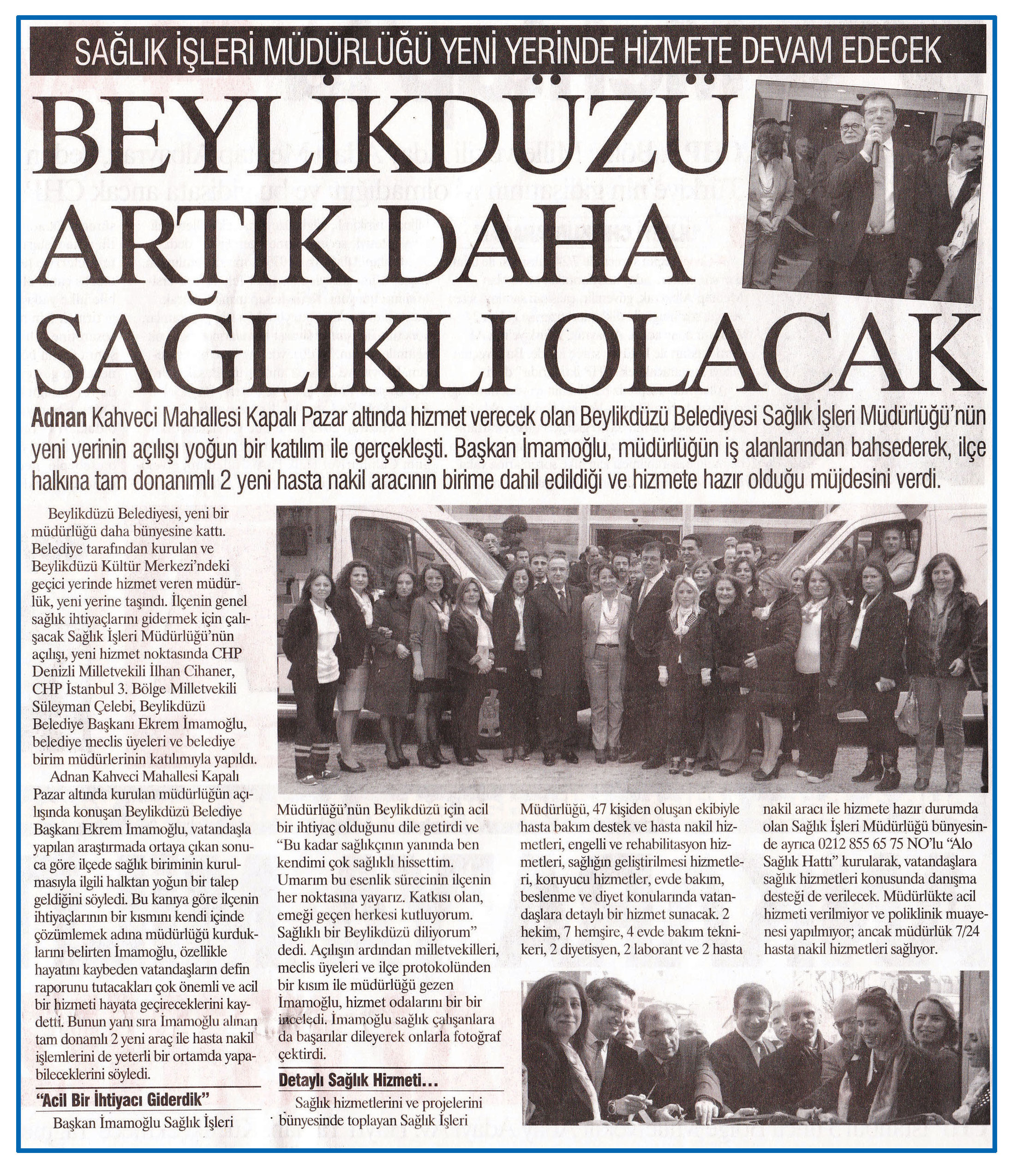26 Mart 2015 tarihli ''AYNA'' gazetesi. Adnan Kahveci Mahallesi Kapalı Pazar altında hizmet verecek olan Beylikdüzü Belediyesi Sağlık İşleri Müdürlüğü'nün yeni yerinin açılışı yoğun bir katılım ile gerçekleşti.Başkan İmamoğlu,müdürlüğün iş alanlarından bahsederek,ilçe halkına tam donanımlı 2 yeni hasta nakil aracının birime dahil edildiği ve hizmete hazır olduğu müjdesini verdi.