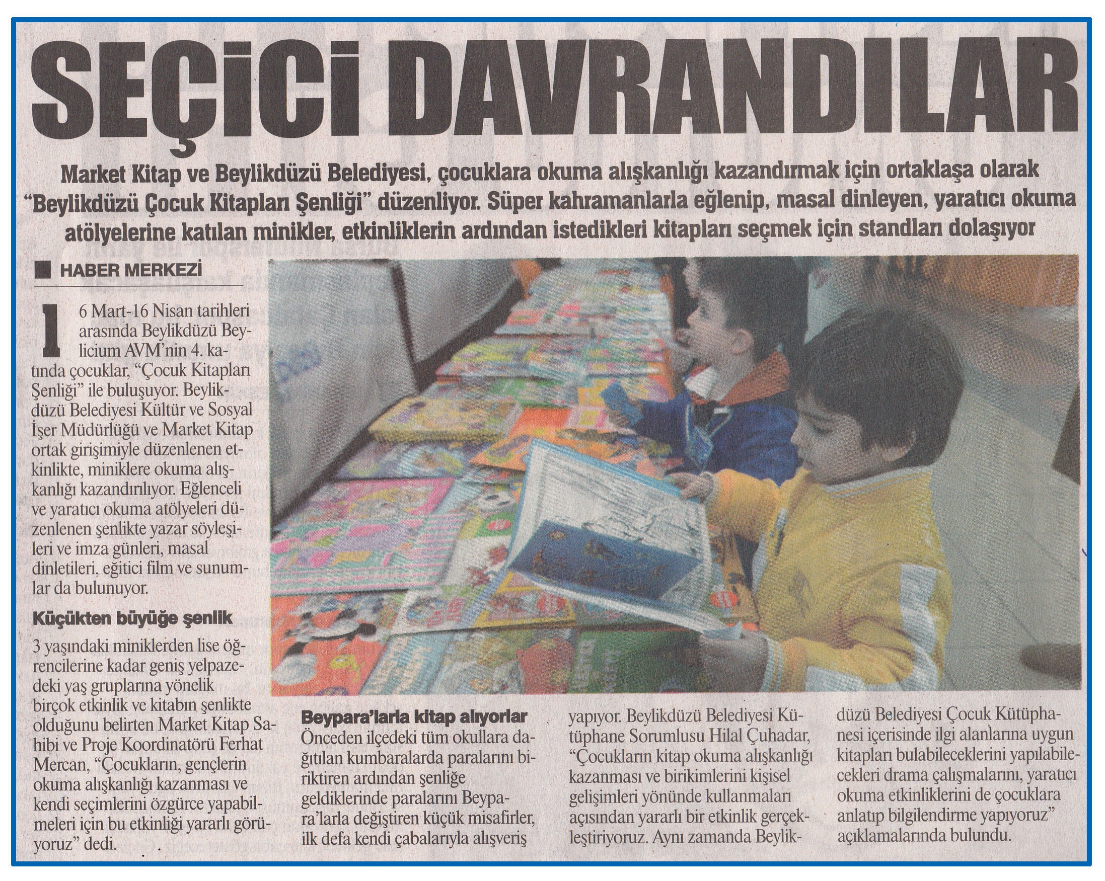 30 Mart 2015 tarihli ''GAZETE İSTANBUL'' gazetesi. Market Kitap ve Beylikdüzü Belediyesi,çocuklara okuma alışkanlığı kazandırmak için ortaklaşa olarak ''Beylikdüzü Çocuk Kitapları Şenliği'' düzenliyor. Süper kahramanlarla eğlenip,masal dinleyen,yaratıcı okuma atölyelerine katılan minikler,etkinliklerin ardından istedikleri kitapları seçmek için standları dolaşıyor.