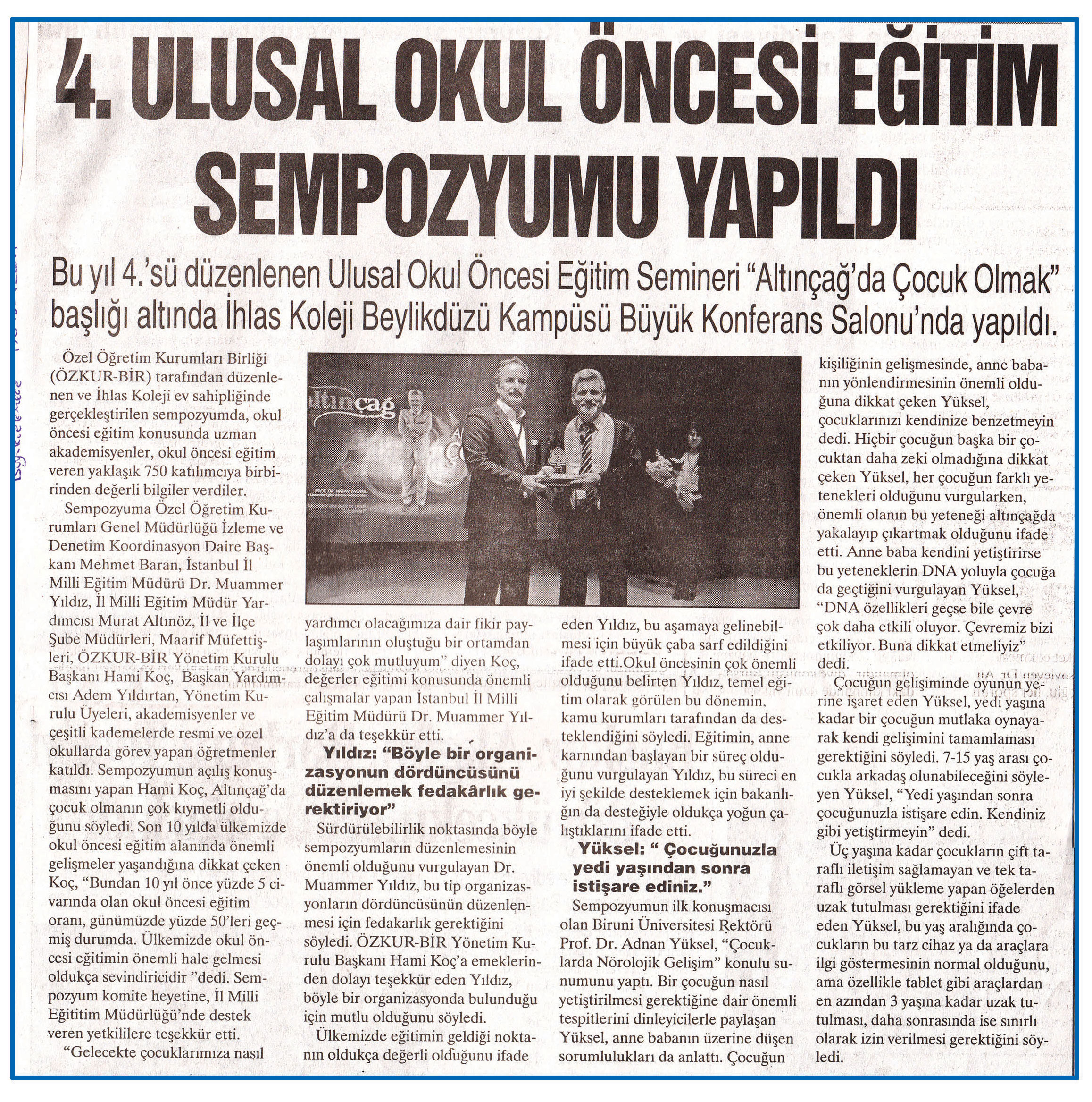 1 Nisan 2015 tarihli ''BÜYÜKÇEKMECE'' gazetesi. Bu yıl 4.'sü düzenlenen Ulusal Okul Öncesi Eğitim Semineri ''Altınçağ'da Çocuk Olmak'' başlığı altında İhlas Koleji Beylikdüzü Kampüsü Büyük Konferans Salonu'nda yapıldı.