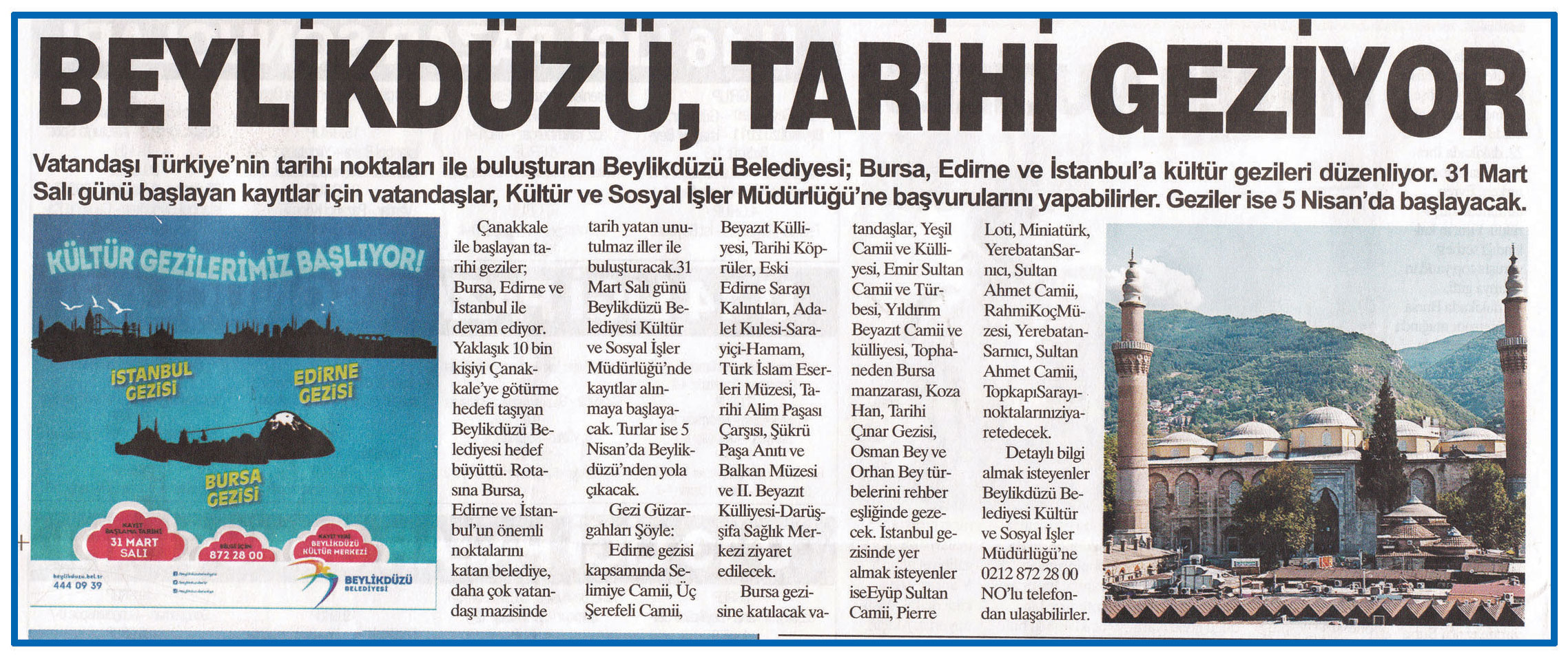 2 Nisan 2015 tarihli ''HABER EKSPRESS'' gazetesi. Vatandaşı Türkiye'nin tarihi noktaları ile buluşturan Beylikdüzü Belediyesi;Bursa,Edirne ve İstanbul'a kültür gezileri düzenliyor.31 Mart Salı günü başlayan kayıtlar için vatandaşlar,Kültür ve Sosyal İşler Müdürlüğü'ne başvurularını yapabilirler.Geziler ise 5 Nisan'da başlayacak.