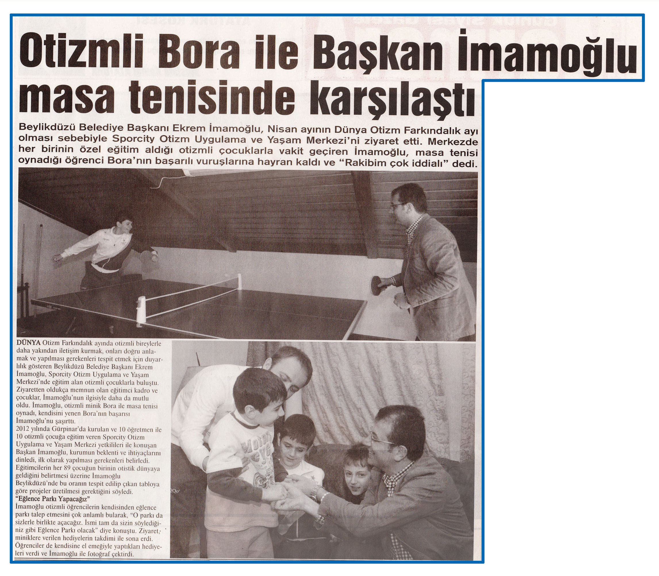 3 Nisan 2015 tarihli ''MARMARA'' gazetesi. Beylikdüzü Belediye Başkanı Ekrem İmamoğlu,Nisan ayının Dünya Otizm Farkındalık ayı olması sebebiyle Sportcity Otizm Uygulama ve Yaşam Merkezi'ni ziyaret etti.Merkezde her birinin özel eğitim aldığı otizmli çocuklarla vakit geçiren imamoğlu,masa tenisi oynadığı öğrenci Bora'nın başarılı vuruşlarına hayran kaldı ve ''Rakibim çok iddaalı'' dedi.