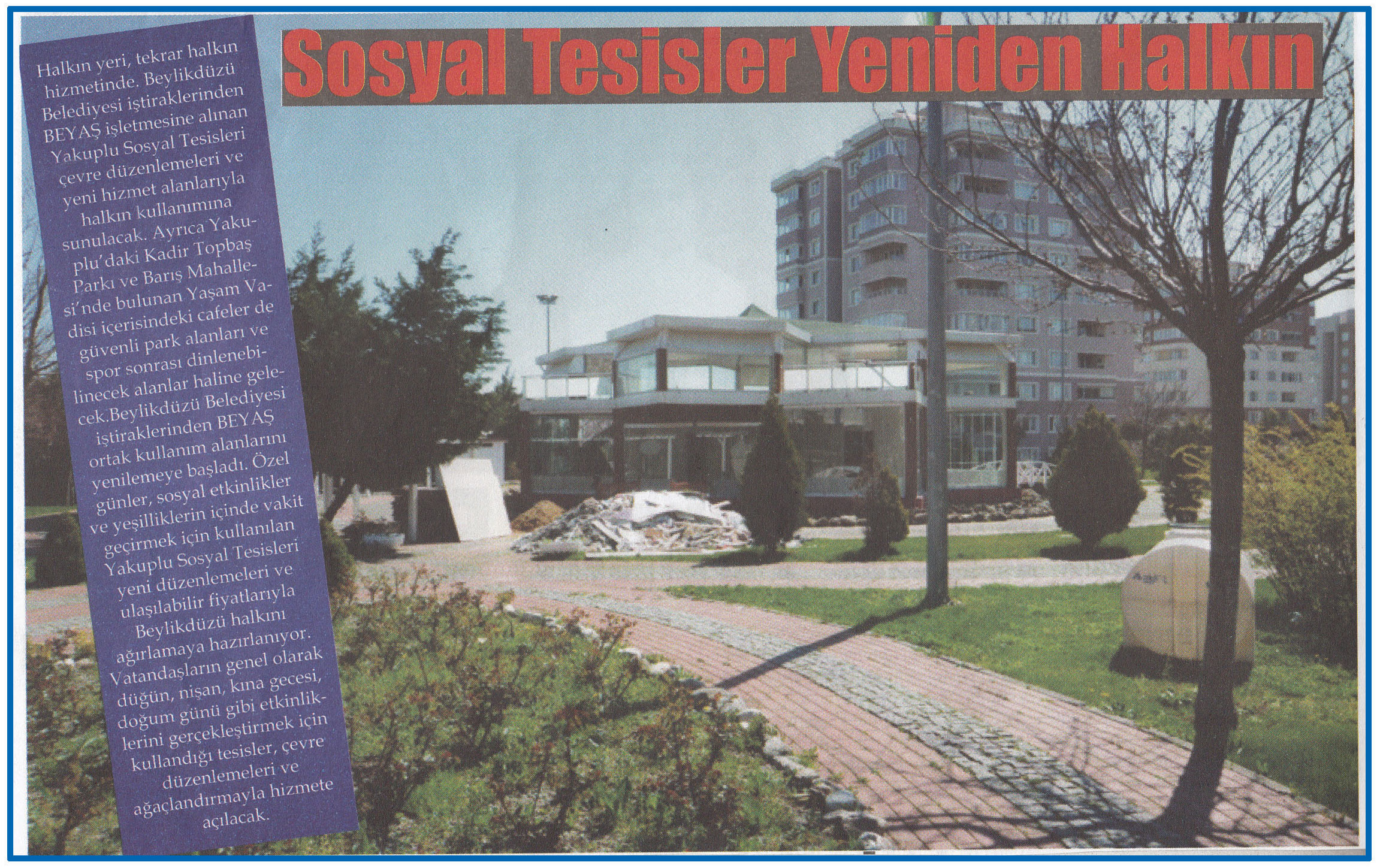 7 Nisan 2015 tarihli ''BEYLİKDÜZÜ'' gazetesi. Halkın yeri, tekrar halkın hizmetinde.Beylikdüzü Belediyesi iştiraklerinden BEYAŞ işletmesine alınan Yakuplu Sosyal Tesisleri çevre düzenlemeleri ve yeni hizmet alanlarıyla halkın kullanımına sunulacak.