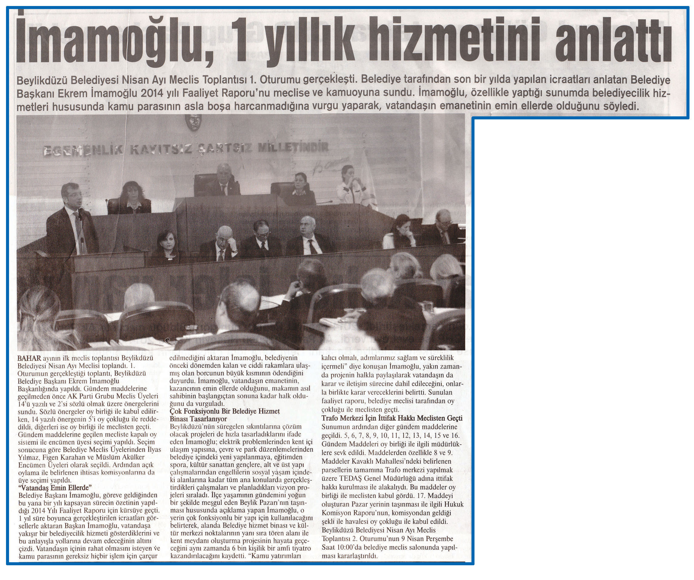 7 Nisan 2015 tarihli ''MARMARA'' gazetesi. Beylikdüzü Belediyesi Nisan Ayı Meclis Toplantısı 1. Oturumu gerçekleşti. Belediye tarafından son bir yılda yapılan icraatları anlatan Belediye Başkanı Ekrem İmamoğlu 2014 yılı Faaliyet Raporu'nu meclise ve kamuoyuna sundu.İmamoğlu,özellikle yaptığı sunumda belediyecilik hizmetleri hususunda kamu parasının asla boşa harcanmadığına vurgu yaparak,vatandaşın emanetinin emin ellerde olduğunu söyledi.