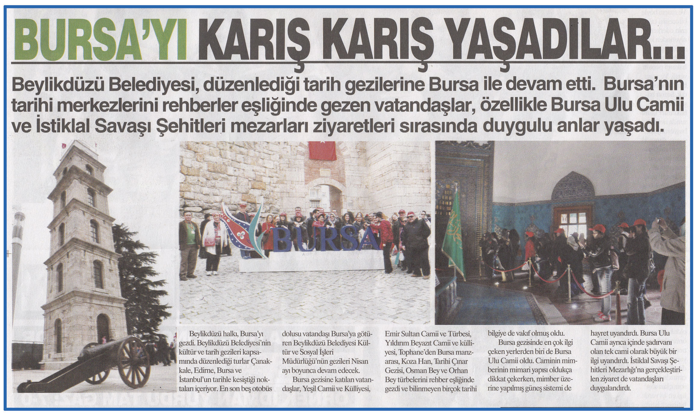 9 Nisan 2015 tarihli ''HABER EKSPRESS'' gazetesi. Beylikdüzü Belediyesi, düzenlendiği tarih gezilerine Bursa ile devam etti. Bursa'nın tarihi merkezlerini rehberler eşliğinde gezen vatandaşlar,özellikle Bursa Ulu Camii ve İstiklal Savaşı Şehitleri mezarları ziyaretleri sırasında duygulu anlar yaşadı.