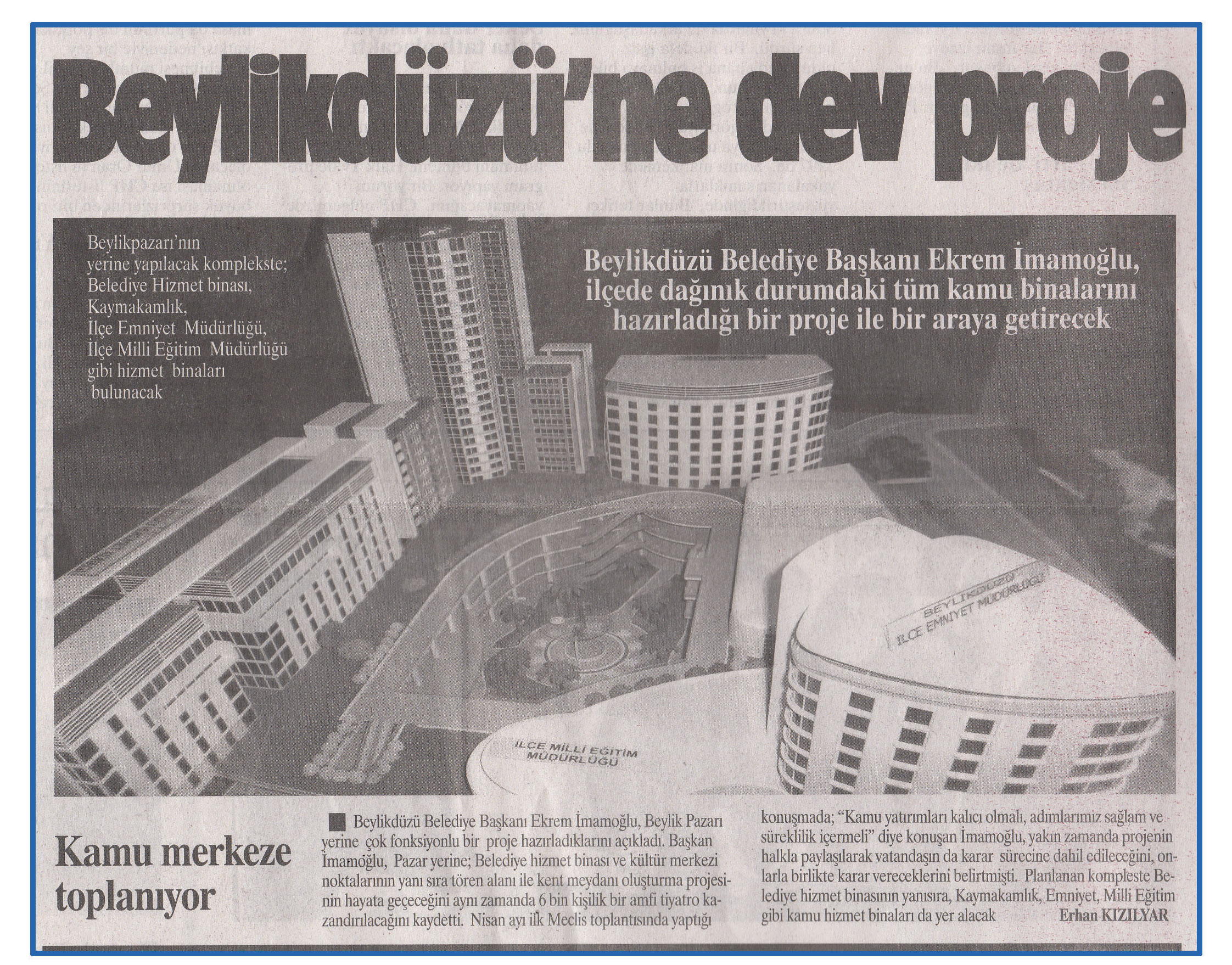10 Nisan 2015 tarihli ''FARK GAZETESİ''. Beylikdüzü Belediye Başkanı Ekrem İmamoğlu,Beylik Pazarı yerine çok fonksiyonlu bir proje hazırladıklarını açıkladı.Başkan İmamoğlu,Pazar yerine;Belediye hizmet binası ve kültür merkezi noktalarının yanı sıra tören alanı ile kent meydanı oluşturma projesinin hayata geçeceğini aynı zamanda 6 bin kişilik bir amfi tiyatro kazandırılacağını kaydetti.