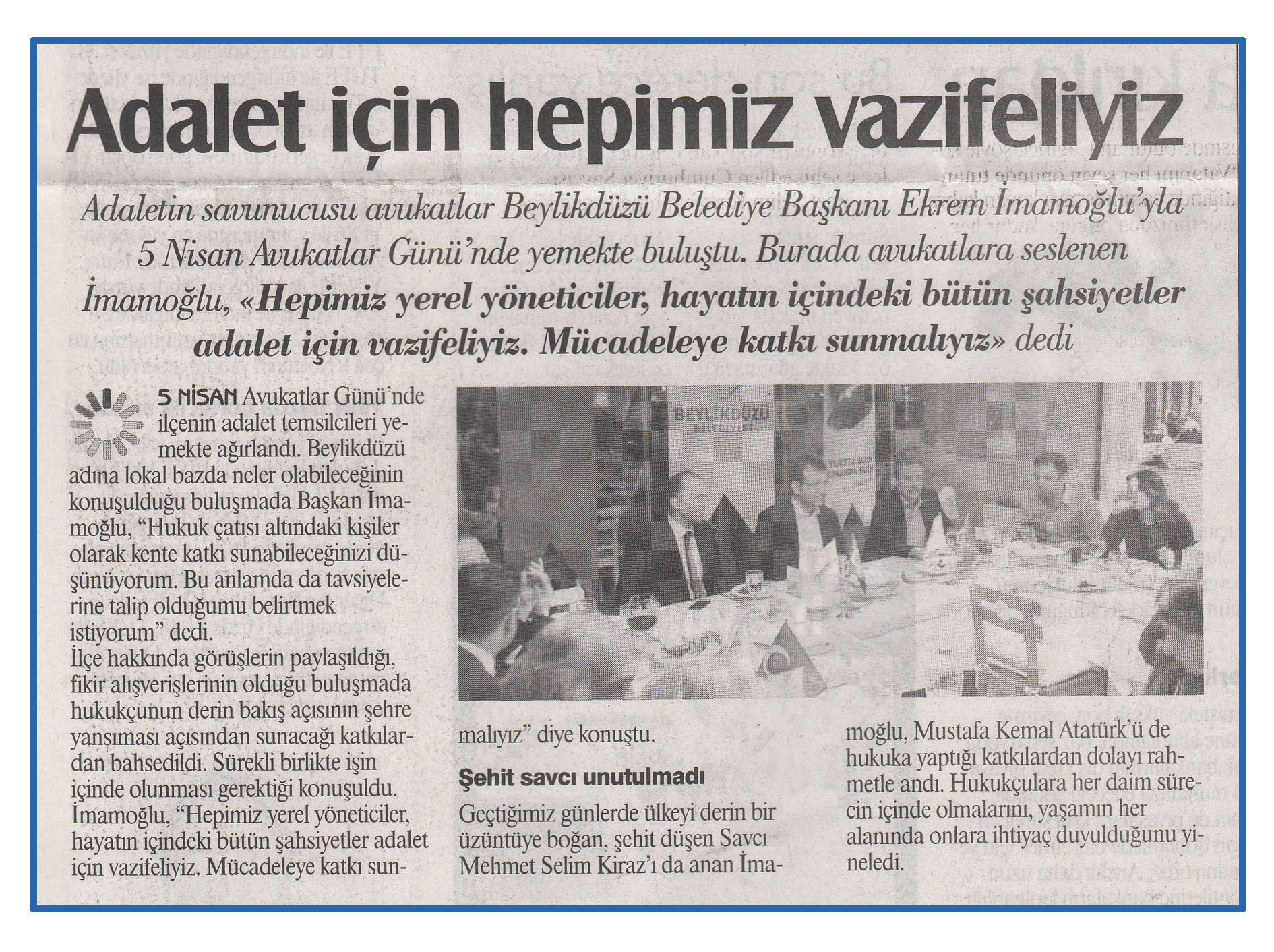 10 Nisan 2015 tarihli ''GAZETE İSTANBUL'' gazetesi. Adaletin savunucusu avukatlar Beylikdüzü Belediye Başkanı Ekrem İmamoğlu'yla 5 Nisan Avukatlar Günü'nde yemekle buluştu. Burada avukatlara seslenen İmamoğlu, ''Hepimiz yerel yöneticiler,hayatın içindeki bütün şahsiyetler adalet için vazifeliyiz.Mücadeleye katkı sunmalıyız'' dedi.