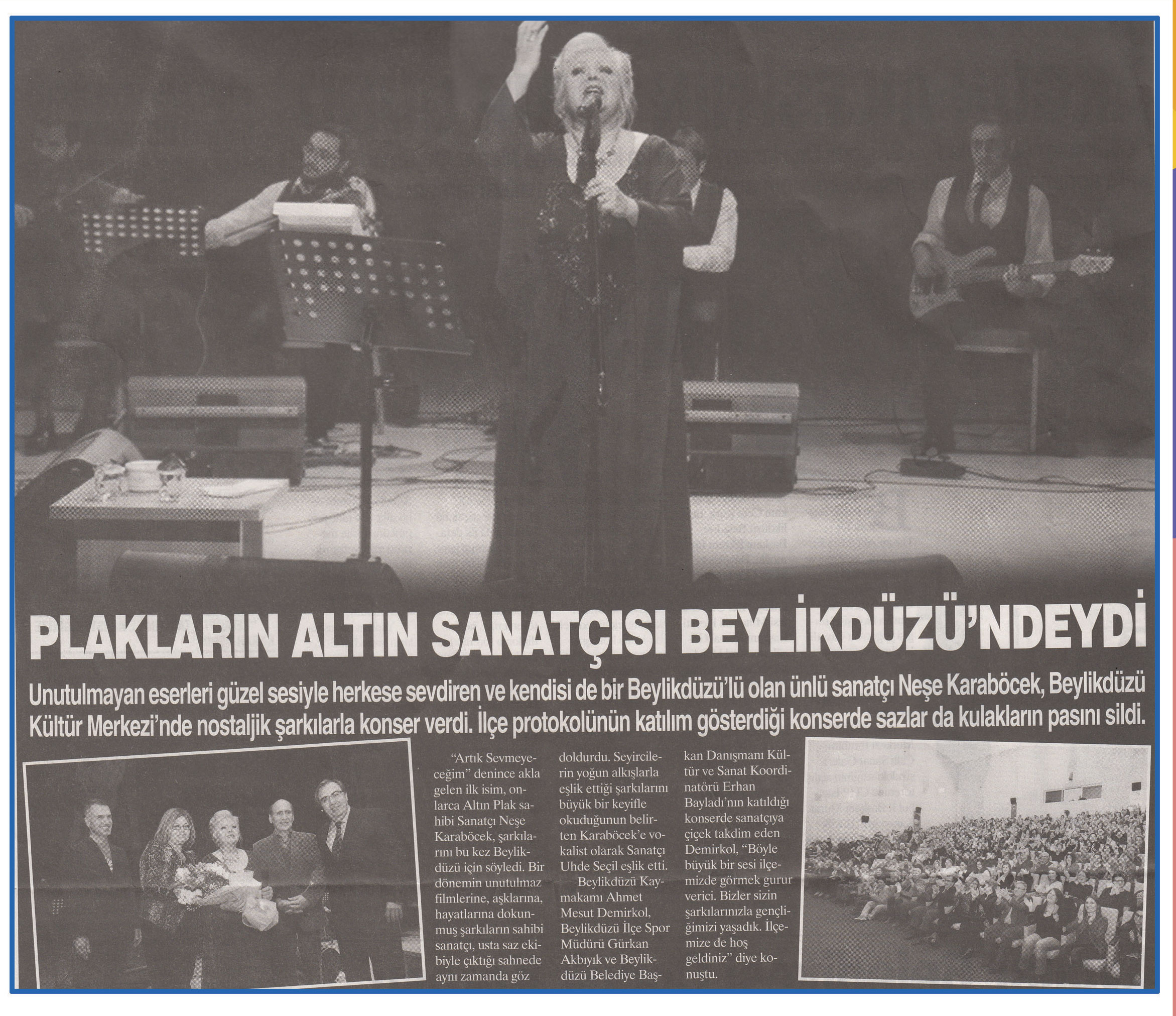 10 Nisan 2015 tarihli ''HABER EKSPRESS'' gazetesi. Unutulmayan eserleri güzel sesiyle herkese sevdiren ve kendisi de bir Beylikdüzü'lü olan ünlü sanatçı Neşe Karaböcek,Beylikdüzü Kültür Merkezi'nde nostaljik şarkılarla konser verdi.