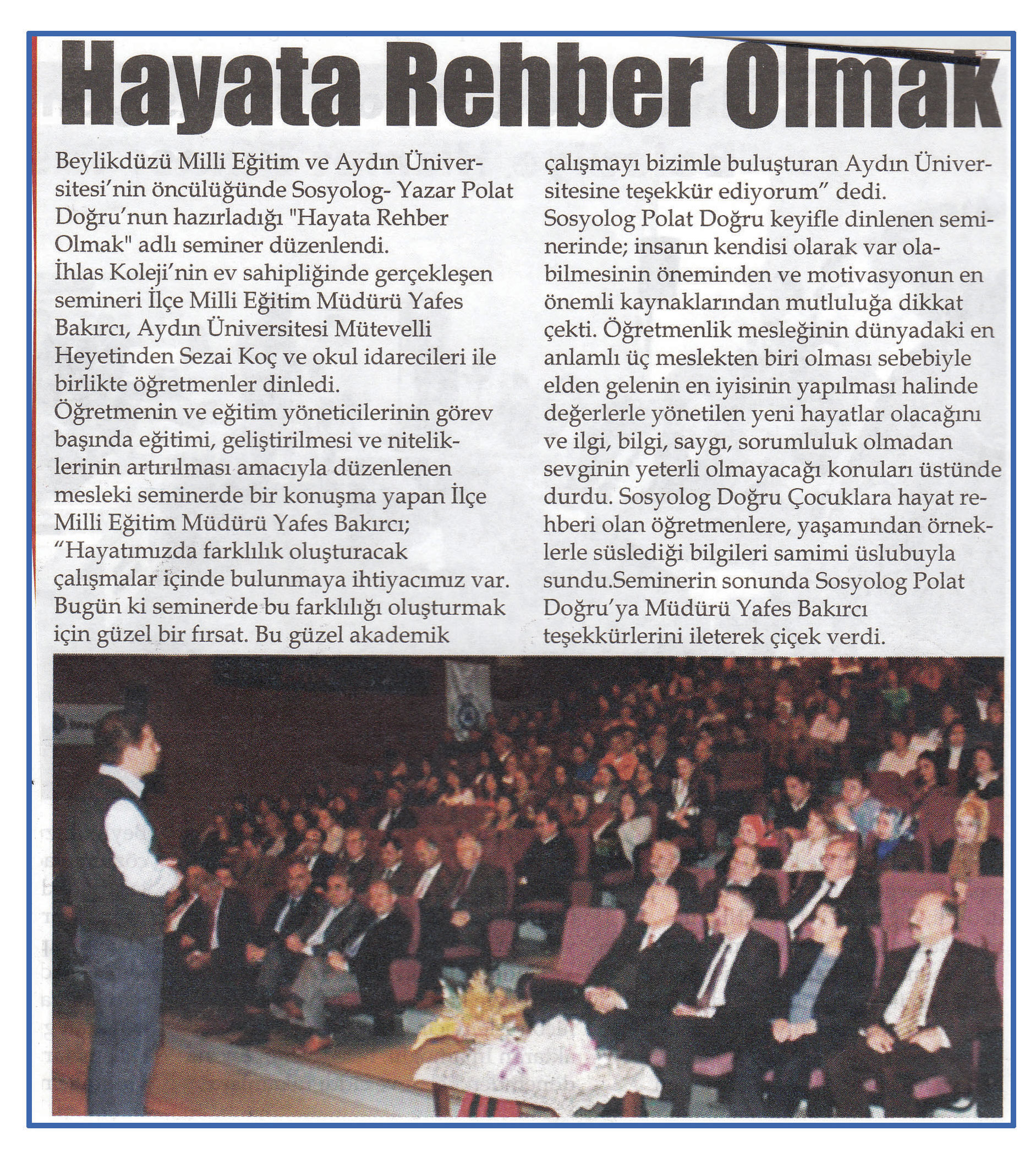 14 Nisan 2015 tarihli ''BEYLİKDÜZÜ'' gazetesi. Beylikdüzü Milli Eğitim ve Aydın Üniversitesi'nin öncülüğü Sosyolog-Yazar Polat Doğru'nun hazırladığı ''Hayata Rehber Olmak'' adlı seminer düzenlendi.