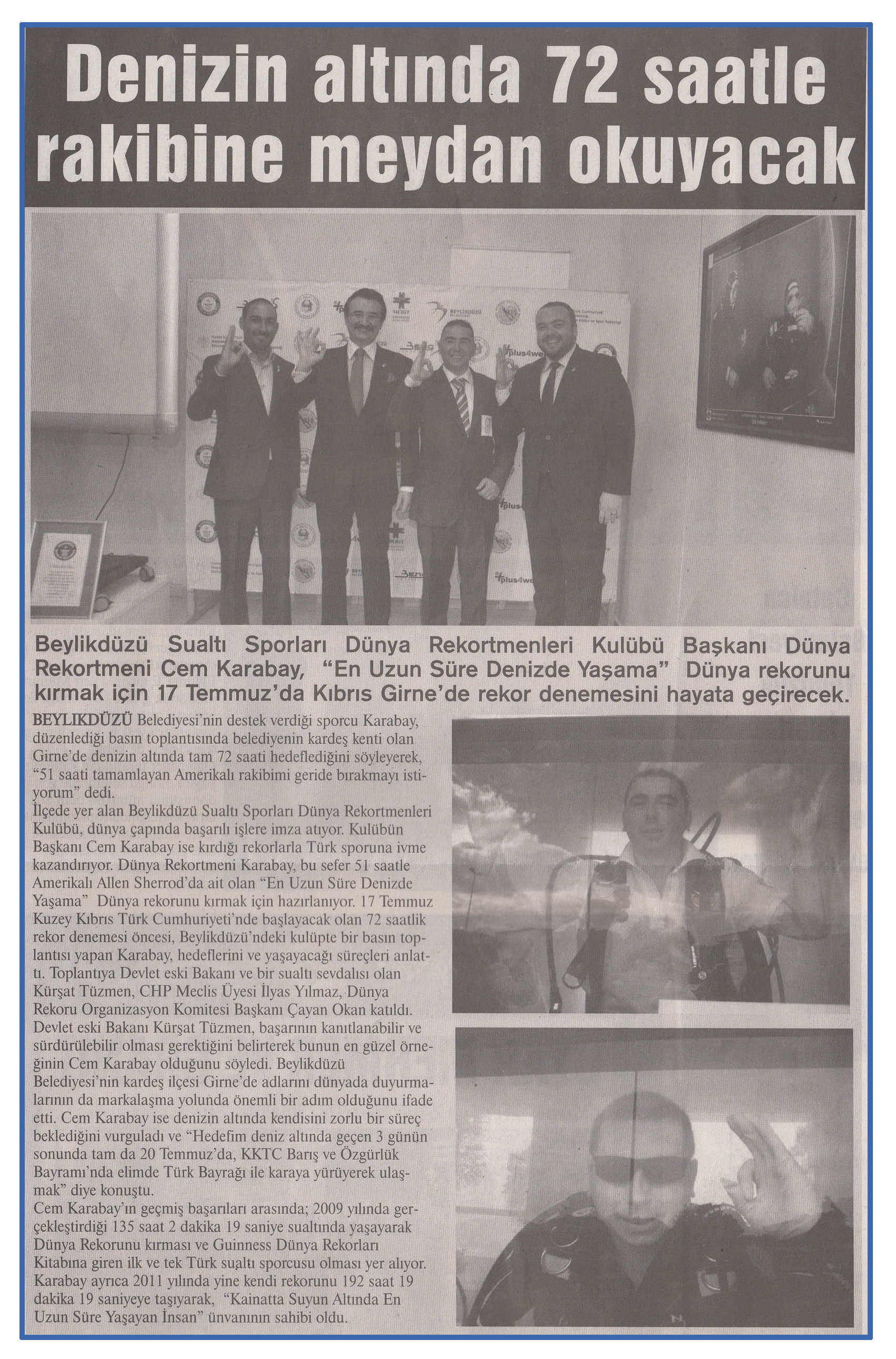 16 Nisan 2015 tarihli ''MARMARA'' gazetesi. Beylikdüzü Sualtı Sporları Dünya Rekortmenleri Kulübü Başkanı Dünya Rekortmeni Cem Karabay, ''En Uzun Süre Denizde Yaşama'' Dünya rekorunu kırmak için 17 Temmuz'da Kıbrıs Girne'de rekor denemesini hayata geçirecek.