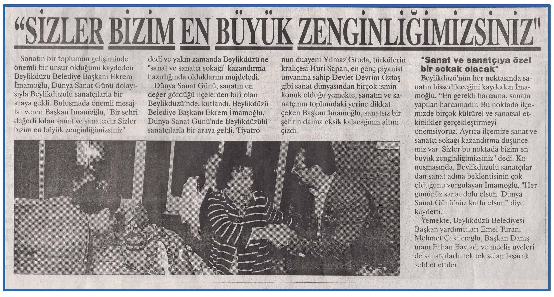 20 Nisan 2015 tarihli ''BÜYÜKÇEKMECE'' gazetesi. Sanatın bir toplumun gelişiminde önemli bir unsur olduğunu kaydeden Beylikdüzü Belediye Başkanı Ekrem İmamoğlu,Dünya Sanat Günü dolayısıyla Beylikdüzü'lü sanatçılarla bir araya geldi.