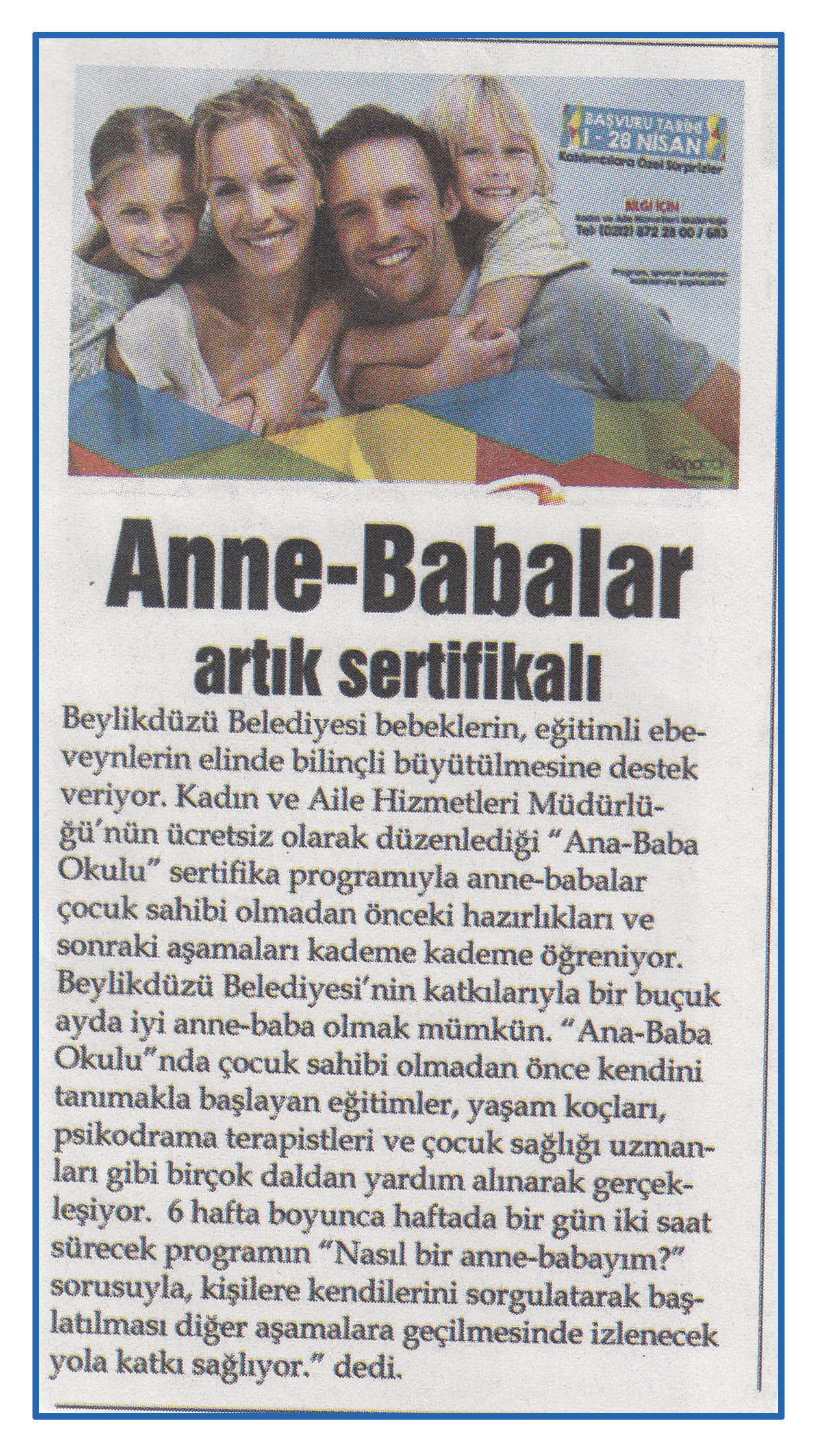 20 Nisan 2015 tarihli ''HÜRBAKIŞ'' gazetesi. Beylikdüzü Belediyesi bebeklerin,eğitimli ebeveynlerin elinde bilinçli büyütülmesine destek veriyor.Kadın ve Aile Hizmetleri Müdürlüğü'nün ücretsiz olarak düzenlediği ''Ana-Baba Okulu'' sertifika programıyla anne-babalar çocuk sahibi olmadan önceki hazırlıkları ve sonraki aşamaları kademe kademe öğreniyor.