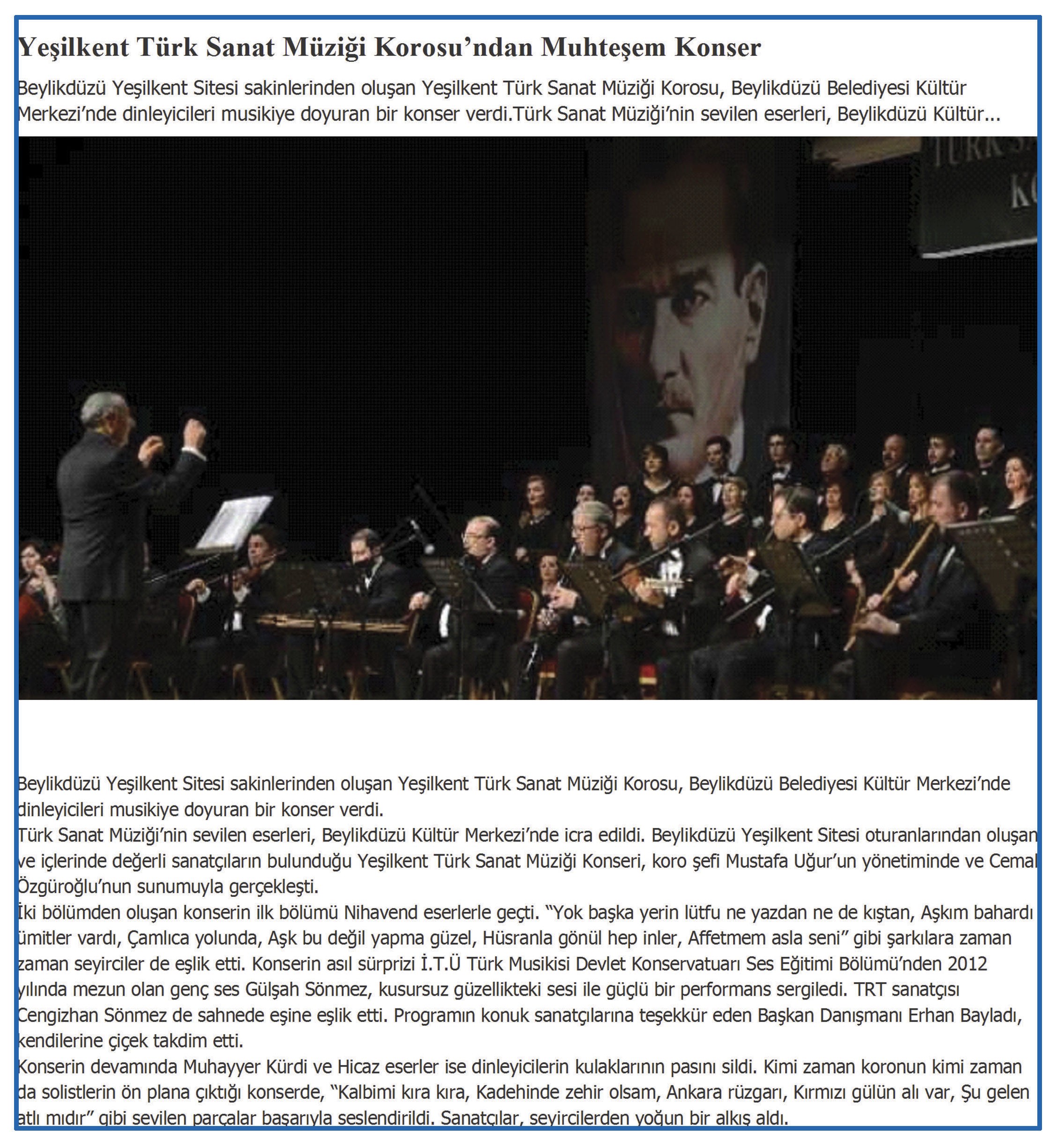 22 Nisan 2015 tarihli ''DOĞUREHBERİ'' gazetesi. Beylikdüzü Yeşilkent Sitesi sakinlerinden oluşan Yeşilkent Türk Sanat Müziği Korosu,Beylikdüzü Belediyesi Kültür Merkezi'nde dinleyicileri musikiye doyuran bir konser verdı.