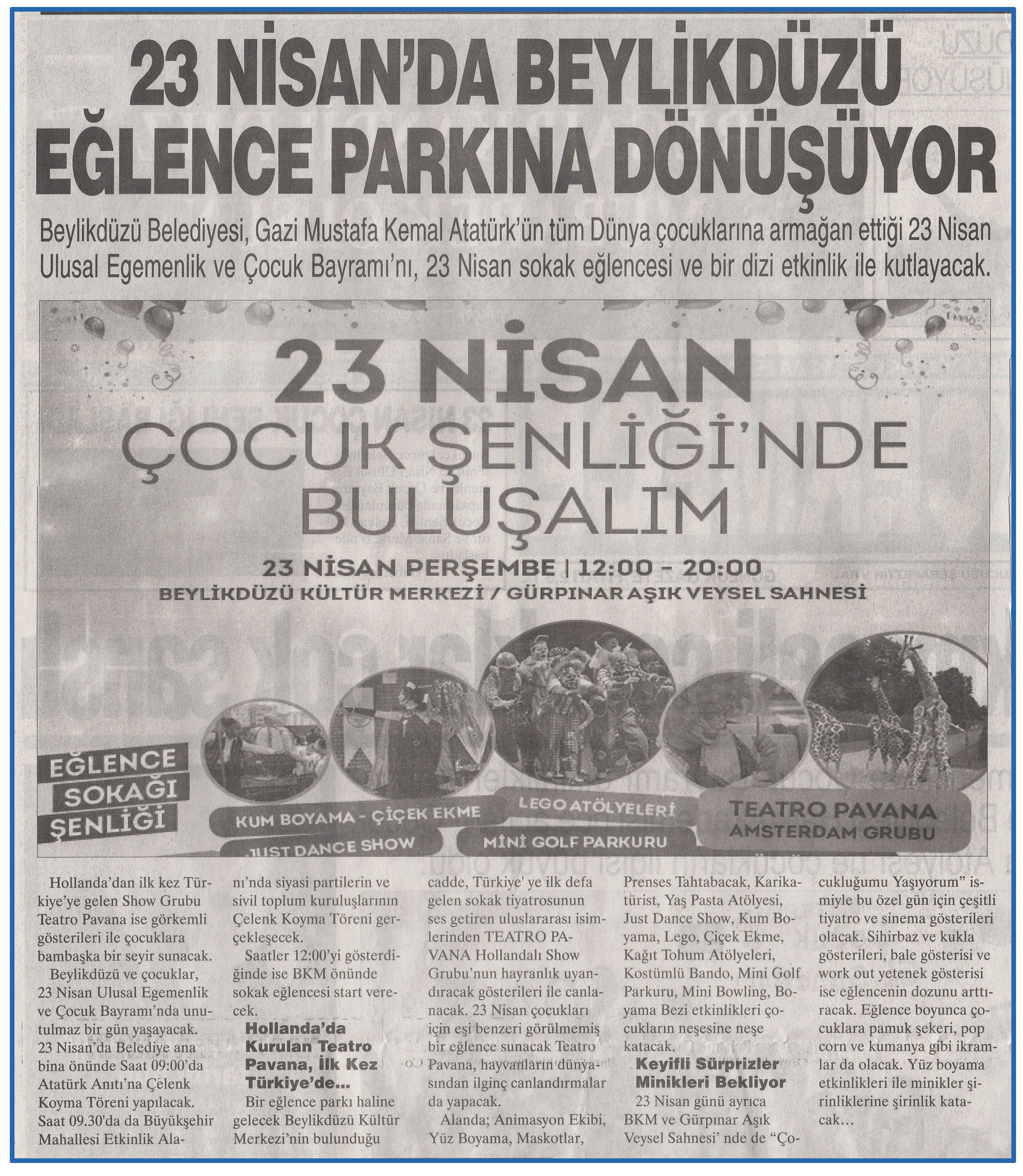 23 Nisan 2015 ''BÜYÜKÇEKMECE'' gazetesi. Beylikdüzü Belediyesi, Gazi Mustafa Kemal Atatürk'ün tüm Dünya çocuklarına armağan ettiği 23 Nisan Ulusal Egemenlik ve Çocuk Bayramı'nı, 23 Nisan sokak eğlencesi ve bir dizi etkinlik ile kutlayacak.