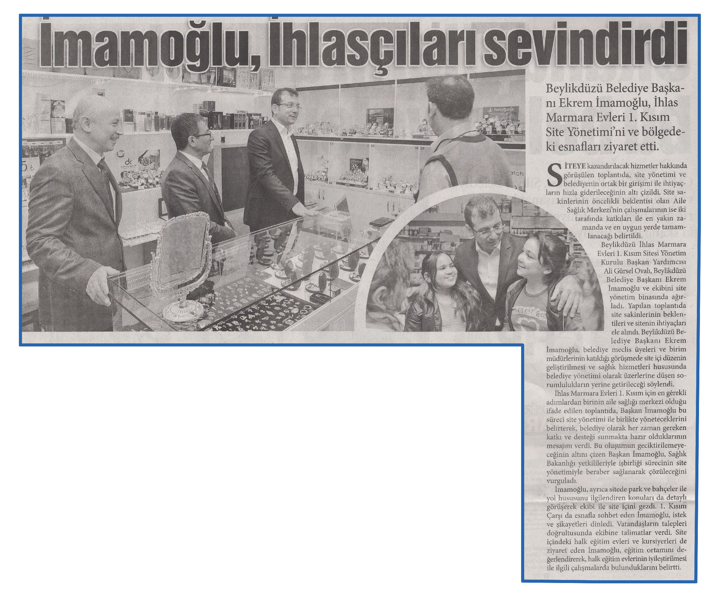 24 Nisan 2015 tarihli ''ANAHTAR'' gazetesi. Beylikdüzü Belediye Başkanı Ekrem İmamoğlu,İhlas Marmara Evleri 1. Kısım Site Yönetimi'ni ve bölgedeki esnafları ziyaret etti.