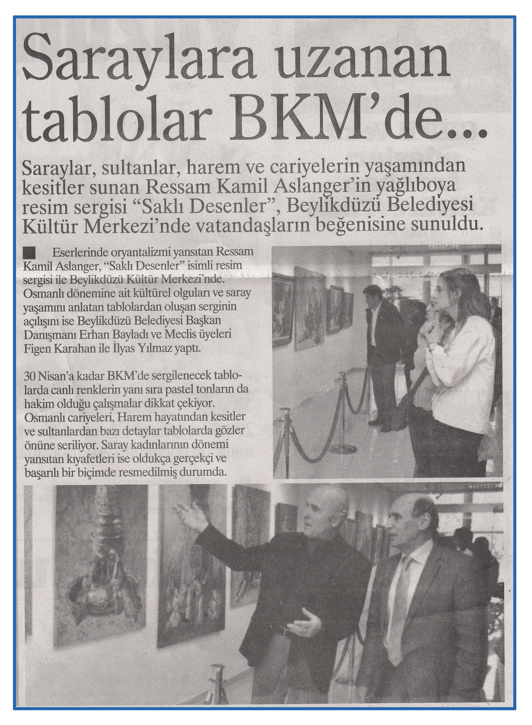 24 Nisan 2015 tarihli ''FARK GAZETESİ''. Saraylar,sultanlar,harem ve cariyelerin yaşamından kesitler sunan Ressam Kamil Aslanger'in yağlıboya resim sergisi ''Saklı Desenler'', Beylikdüzü Belediyesi Kültür Merkezi'nde vatandaşların beğenisine sunuldu.