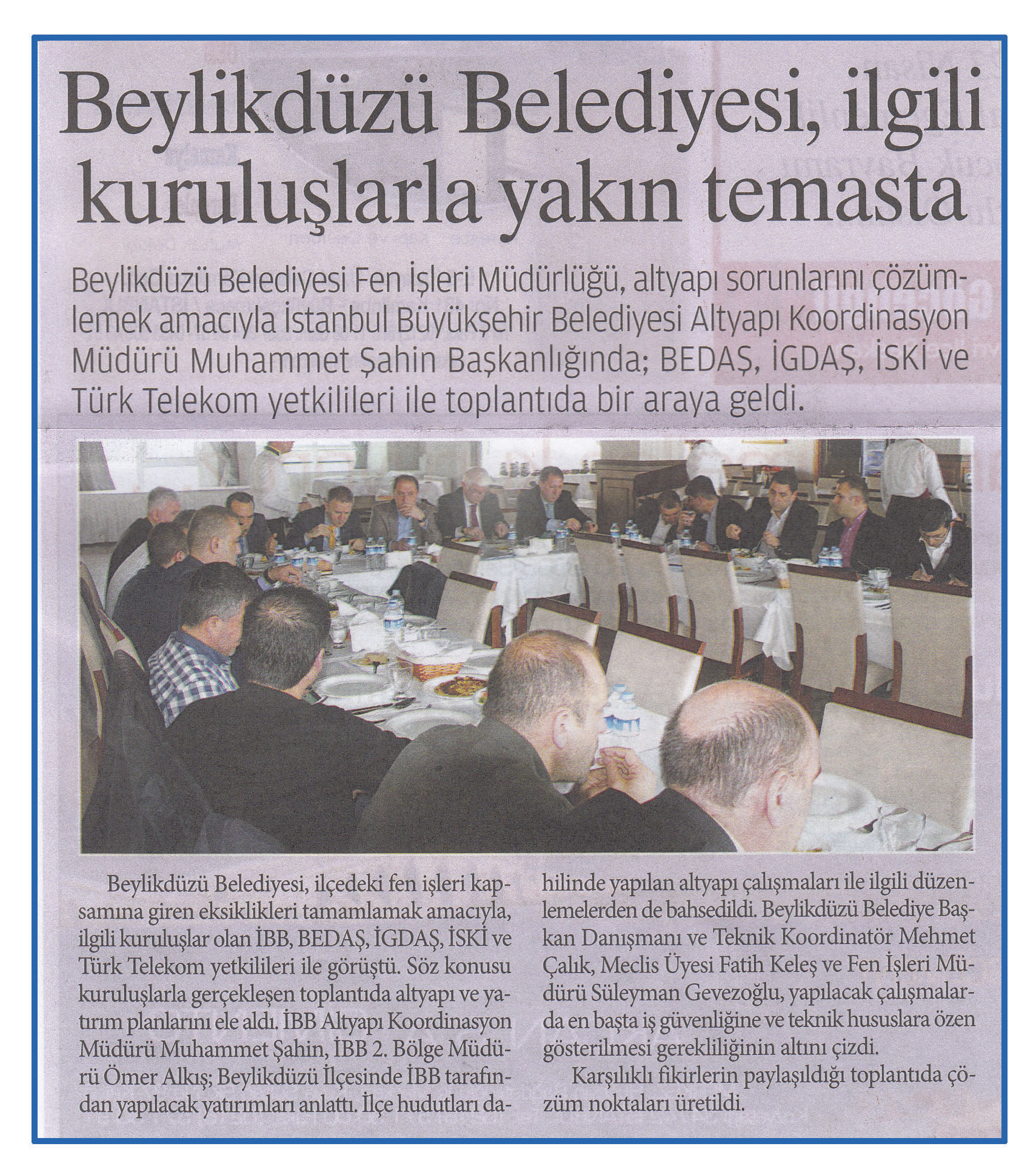 27 Nisan 2015 tarihli ''BİZİMYAŞAM'' gazetesi. Beylikdüzü Belediyesi Fen İşleri Müdürlüğü,altyapı sorunlarını çözümlemek amacıyla İstanbul Büyükşehir Belediyesi Altyapı Koordinasyon Müdürü Muhammet Şahin Başkanlığında;BEDAŞ,İĞDAŞ,İSKİ ve Türk Telekom yetkilileri ile toplantıda bir araya geldi.