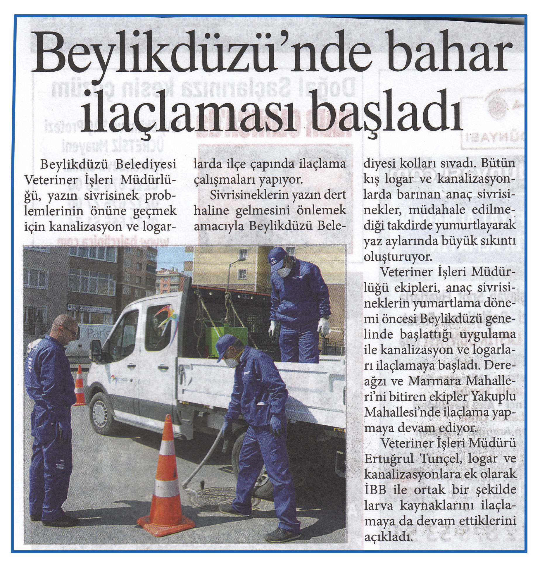27 Nisan 2015 tarihli ''BİZİMYAŞAM'' gazetesi. Beylikdüzü Belediyesi Veteriner İşleri Müdürlüğü,yazın sivrisinek problemlerinin önüne geçmek için kanalizasyon ve logarlarda ilçe çapında ilaçlama çalışmaları yapıyor.