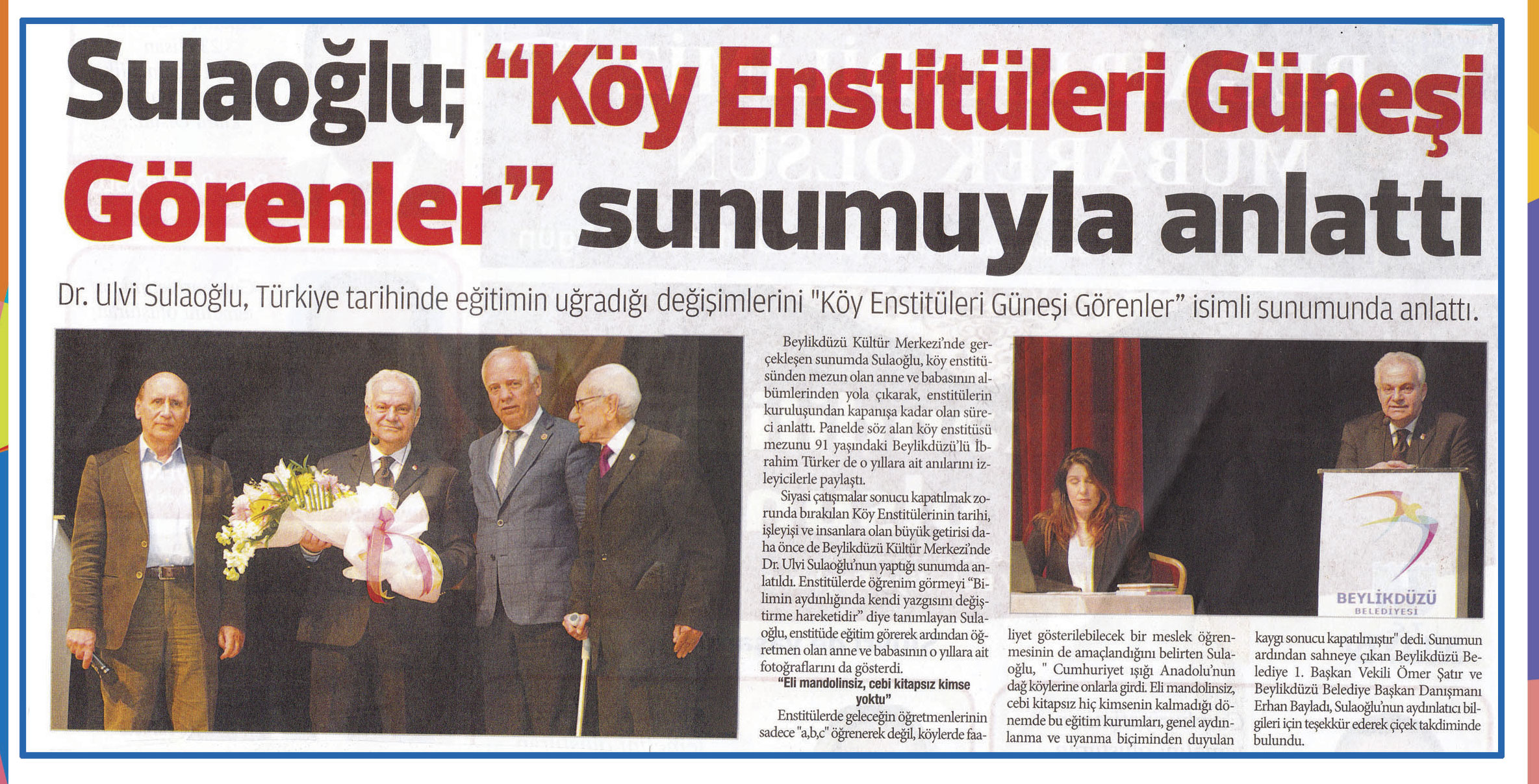 27 Nisan 2015 tarihli ''BİZİMYAŞAM'' gazetesi. Dr. Ulvi Sulaoğlu,Türkiye tarihinde eğitimin uğradığı değişimlerini ''Köy Enstitüleri Güneşi Görenler'' isimli sunumunda anlattı.