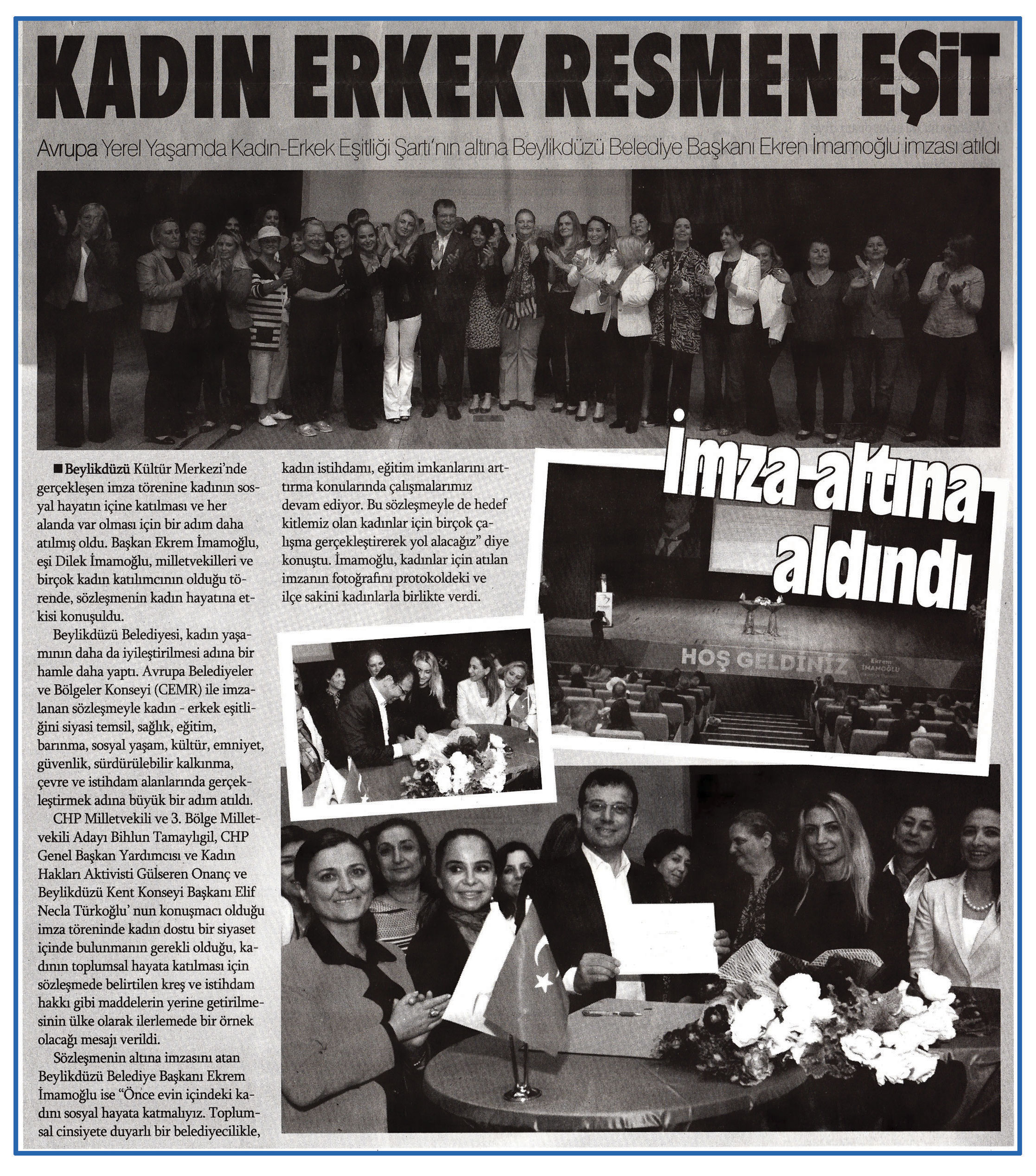 8 Haziran 2015 tarihli "HABER EKSPRESS" gazetesi. Avrupa Yerel Yaşamda Kadın-Erkek Eşitliği Şartı'nın altına Beylikdüzü Belediye Başkanı Ekrem İmamoğlu imzası atıldı. Beylikdüzü Kültür Merkezi'nde gerçekleşen imza törenine kadının sosyal hayatının içine katılması ve her alanda var olması için bir adım daha atılmış oldu.