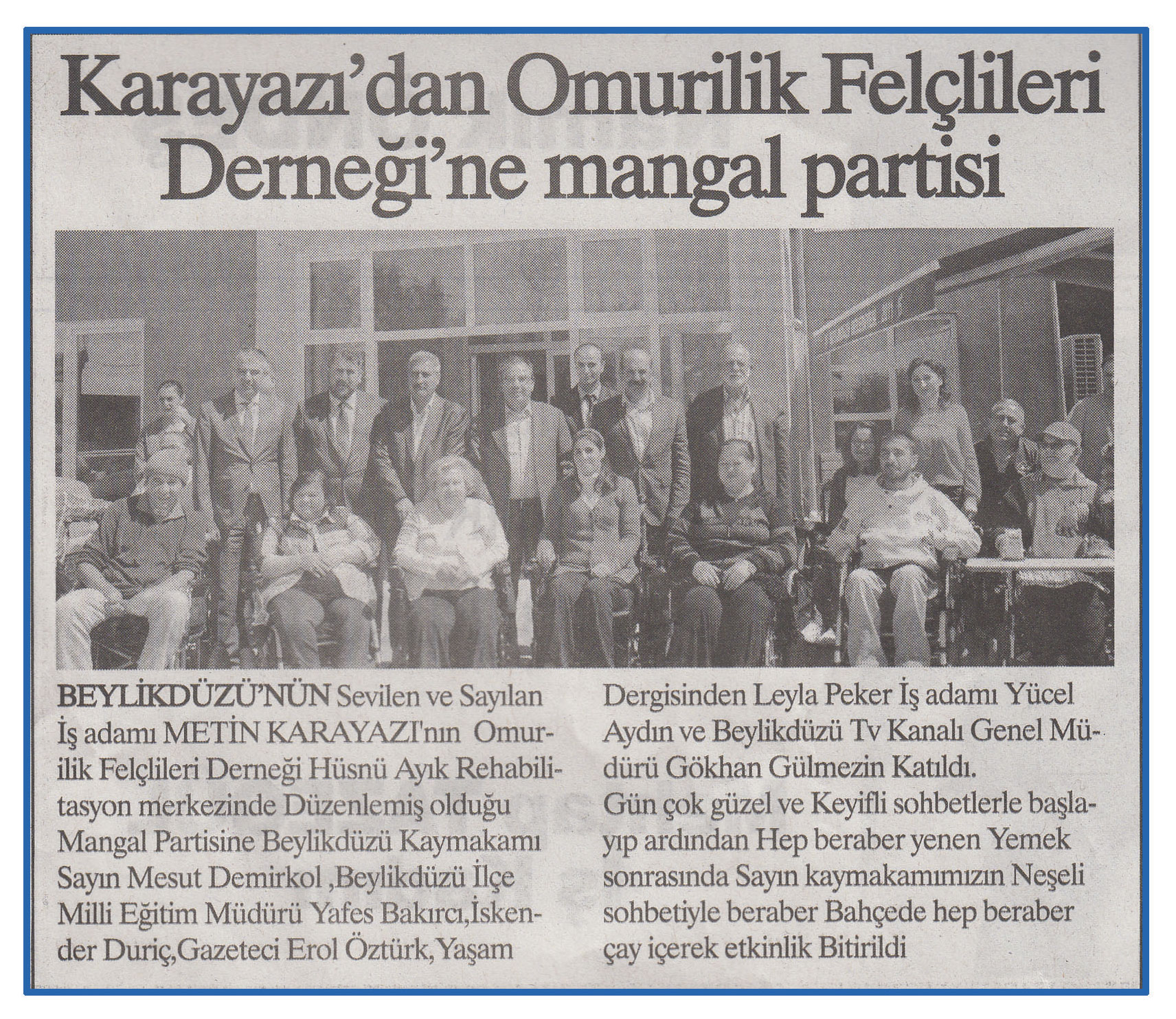27 Nisan 2015 tarihli ''MEDYA 34'' gazetesi. Beylikdüzü'nün Sevilen ve Sayılan İş adamı METİN KARAYAZI'nın Omurilik Felçlileri Derneği Hüsnü Ayık Rehabilitasyon merkezinde Düzenlemiş olduğu Mangal Partisine Beylikdüzü Kaymakamı Mesut Demirkol,Beylikdüzü İlçe Milli Eğitim Müdürü Yafes Bakırcı,İskender Duriç,Gazeteci Erol Öztürk,Yaşam Dergisinden Leyla Peker İş adamı Yücel Aydın ve Beylikdüzü Tv Kanalı Genel Müdürü Gökhan Gülmezin katıldı.
