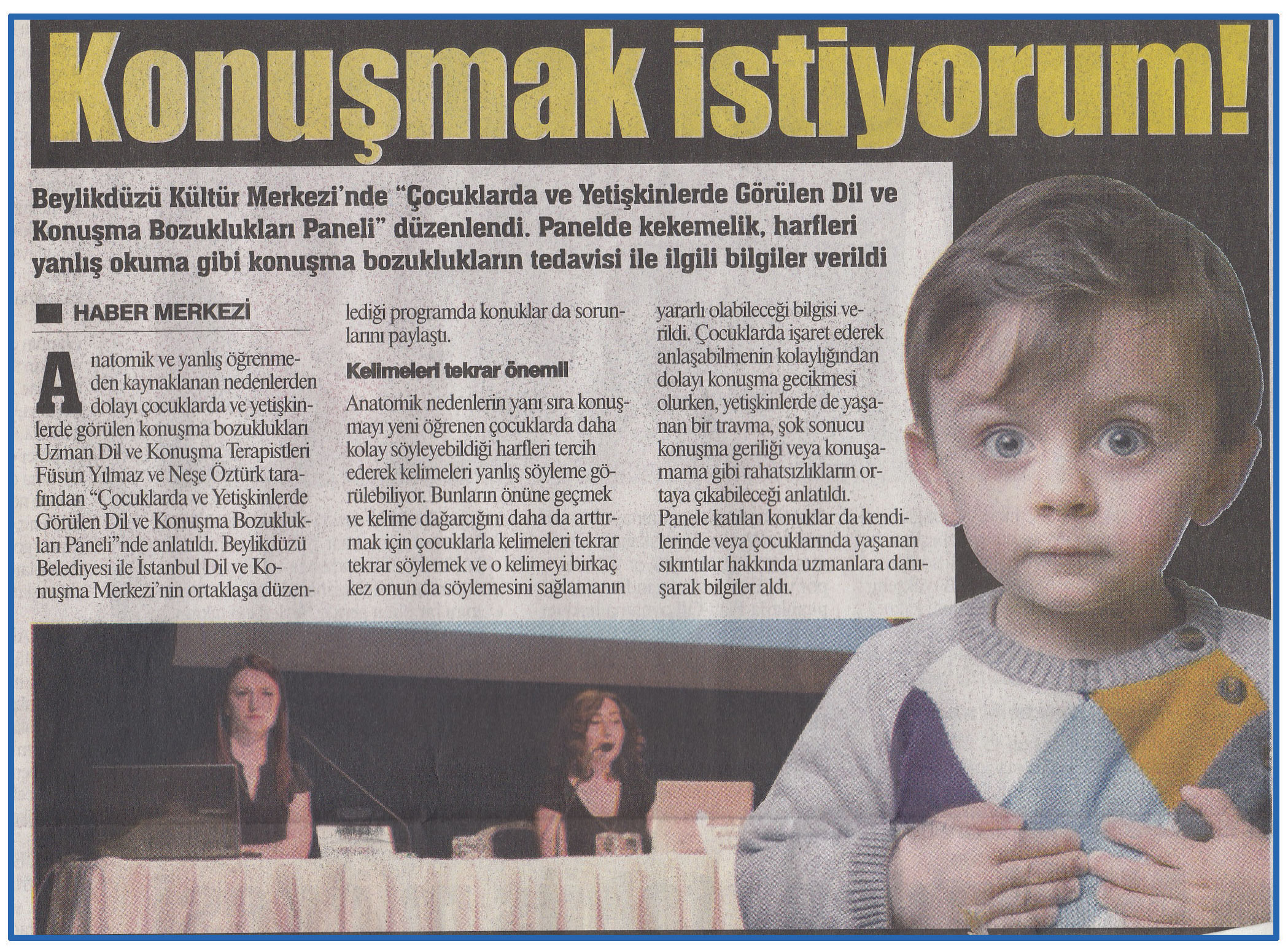 30 Nisan 2015 tarihli ''GAZETE İSTANBUL'' gazetesi. Beylikdüzü Kültür Merkezi'nde ''Çocuklarda ve Yetişkinlerde Görülen Dil ve Konuşma Bozuklukları Paneli'' düzenlendi.Panelde kekemelik,harfleri yanlış okuma gibi konuşma bozukluklarının tedavisi ile ilgili bilgiler verildi.