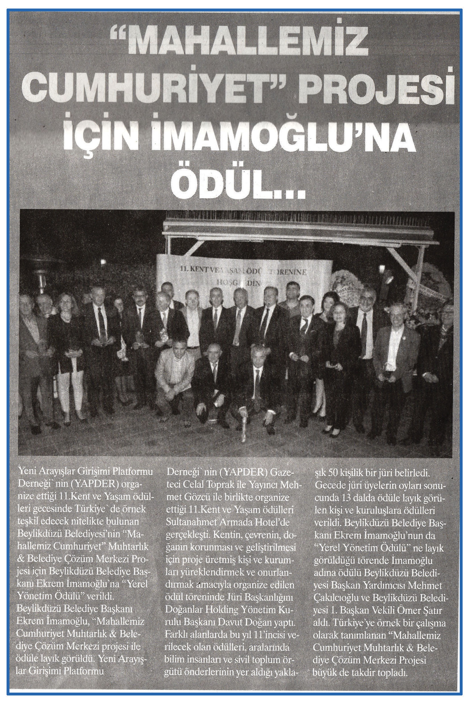 10 Haziran 2015 tarihli "YENİ GÜN" gazetesi. Yeni Arayışlar Girişimi Platformu Derneği'nini (YAPDER) organize ettiği 11.Kent ve Yaşam Ödülleri gecesinde Türkiye'de örnek teşkil edecek nitelikte bulunan Beylikdüzü Belediyesi'nin " Mahallemiz Cumhuriyet" Muhtarlık ve Belediye Çözüm Merkezi Projesi için Beylikdüzü Belediye Başkanı Ekrem İmamoğlu'na " Yerel Yönetim Ödlü" verildi.
