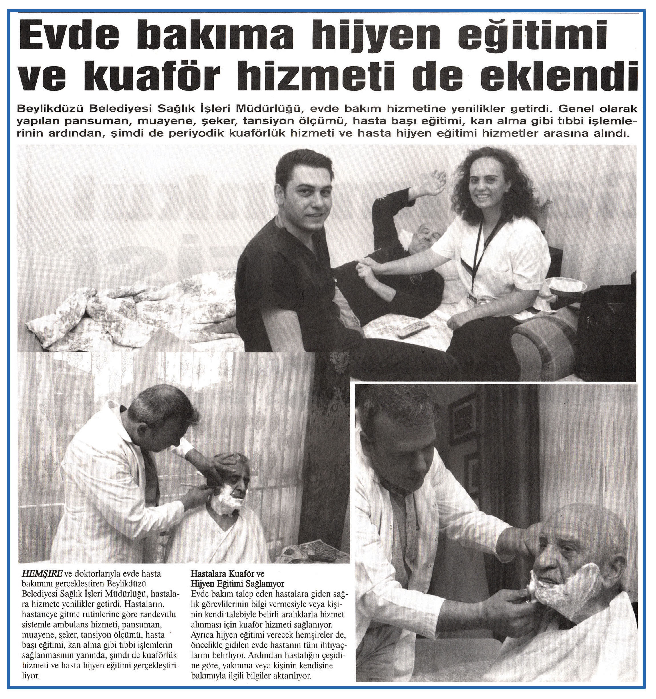 11 Haziran 2015 tarihli " MARMARA" gazetesi. Beylikdüzü Belediyesi Sağlık İşeri Müdürlüğü, evde bakım hizmetine yenilikler getirdi. Genel olarak yapılan pansuman, muayene, şeker, tansiyon ölçümü, hasta başı eğitimi, kan alma gibi tıbbi işlemlerinin ardından, şimdi de periyodik kuaförlük hizmeti ve hasta hijyen eğitimi hizmetler arasına alındı.