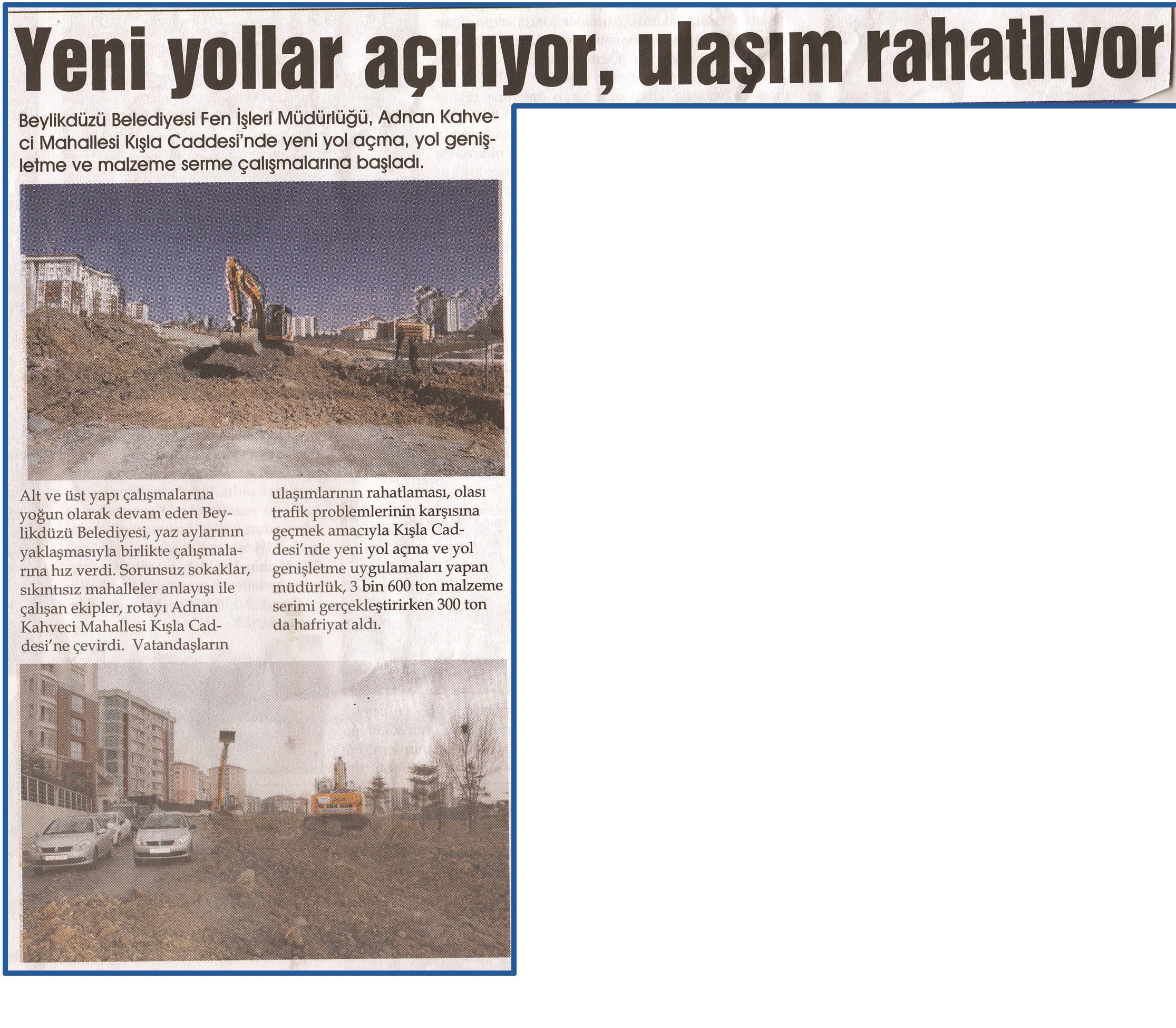 4 Mayıs 2015 tarihli ''HÜRBAKIŞ'' gazetesi. Beylikdüzü Belediyesi Fen İşleri Müdürlüğü,Adnan Kahveci Mahallesi Kışla Caddesi'nde yeni yol açma,yol genişletme ve malzeme serme çalışmalarına başladı.