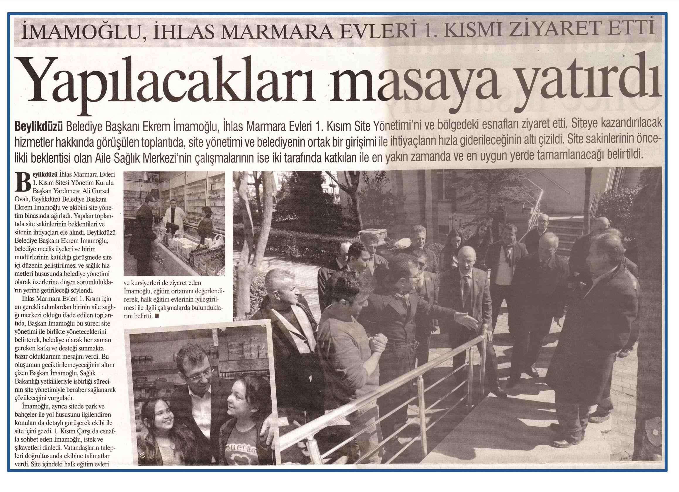 5 Mayıs 2015 tarihli ''AYNA'' gazetesi. Beylikdüzü Belediye Başkanı Ekrem İmamoğlu,İhlas Marmara Evleri 1. Kısım Site Yönetimi'ni ve bölgedeki esnafları ziyaret etti. Siteye kazandırılacak hizmetler hakkında görüşülen toplantıda,site yönetimi ve belediyenin ortak bir girişimi ile ihtiyaçların hızla giderileceğinin altı çizildi.Site sakinlerinin öncelikli beklentisi olan Aile Sağlık Merkezi'nin çalışmalarının ise iki tarafında katkıları ile en yakın zamanda ve en uygun yerde tamamlanacağı belirtildi.