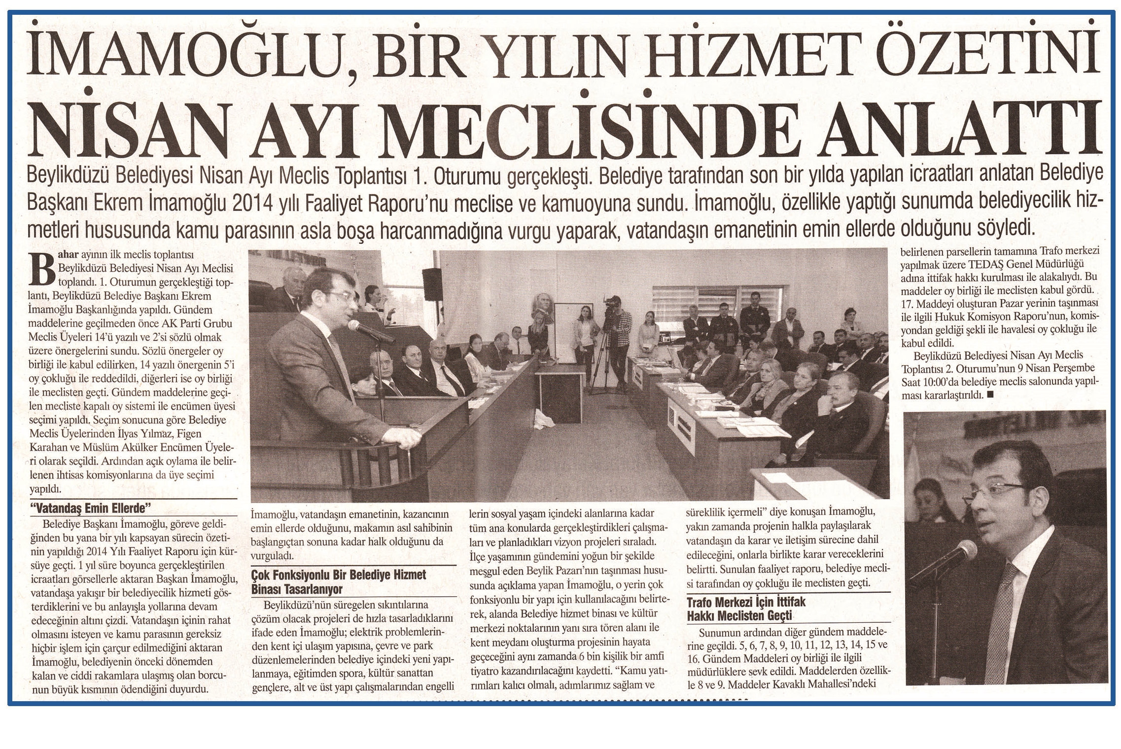 5 Mayıs 2015 tarihli ''AYNA'' gazetesi. Beylikdüzü Belediyesi Nisan Ayı Meclis Toplantısı 1. Oturumu gerçekleşti. Belediye tarafından son bir yılda yapılan icraatları anlatan Belediye Başkanı Ekrem İmamoğlu 2014 yılı Faaliyet Raporu'nu meclise ve kamuoyuna sundu.İmamoğlu,özellikle yaptığı sunumda belediyecilik hizmetleri hususunda kamu parasının asla boşa harcanmadığına vurgu yaparak,vatandaşın emanetinin emin ellerde olduğunu söyledi