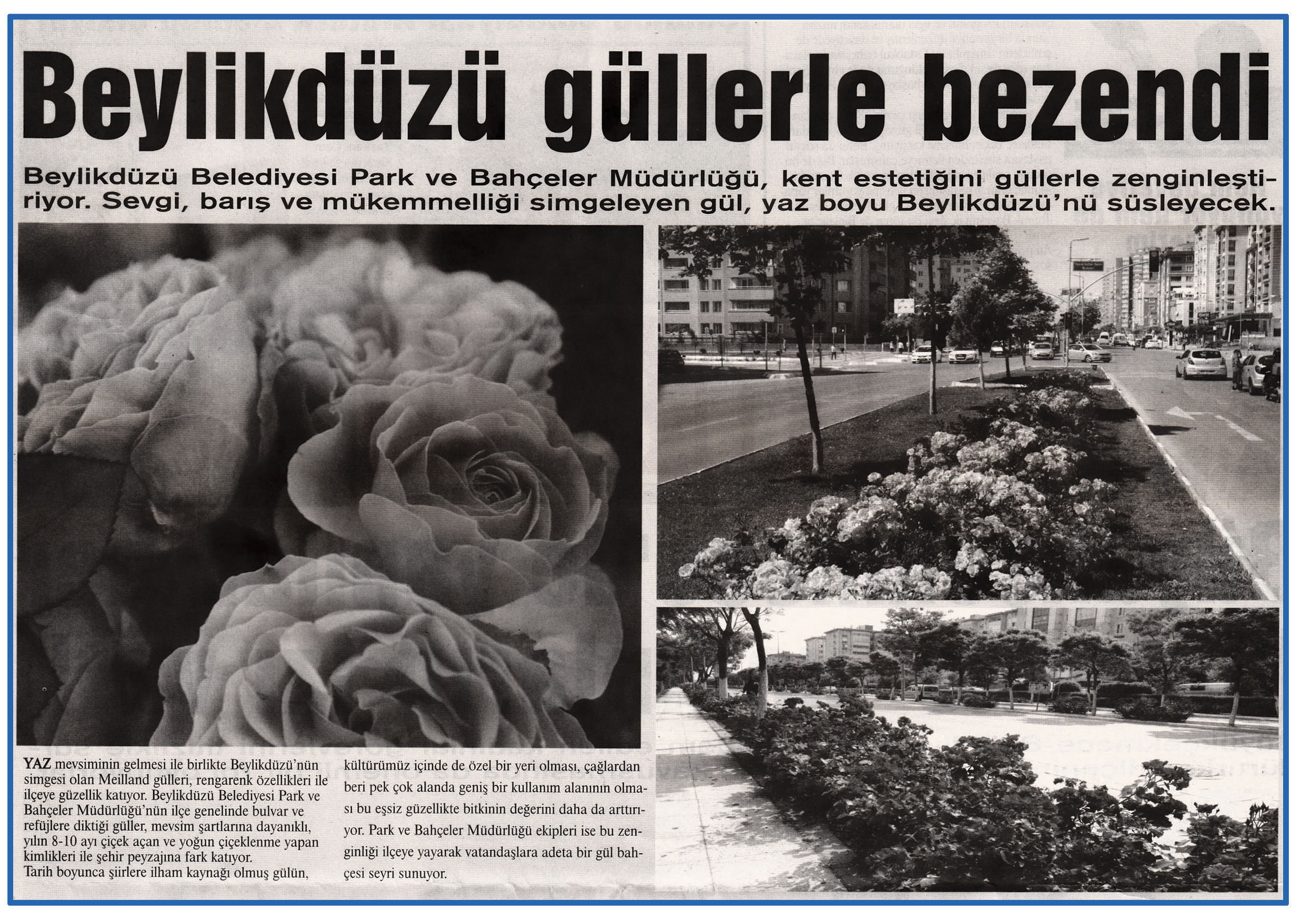 11 Haziran 2015 tarihli "MARMARA" gazetesi. Beylikdüzü Belediyesi Park ve Bahçeler Müdürlüğü, kent estetiğini güllerle zenginleştiriyor. Sevgi, barış ve mükemmelliği simgeleyen gül, yaz boyu Beylikdüzü'nü süsleyecek.