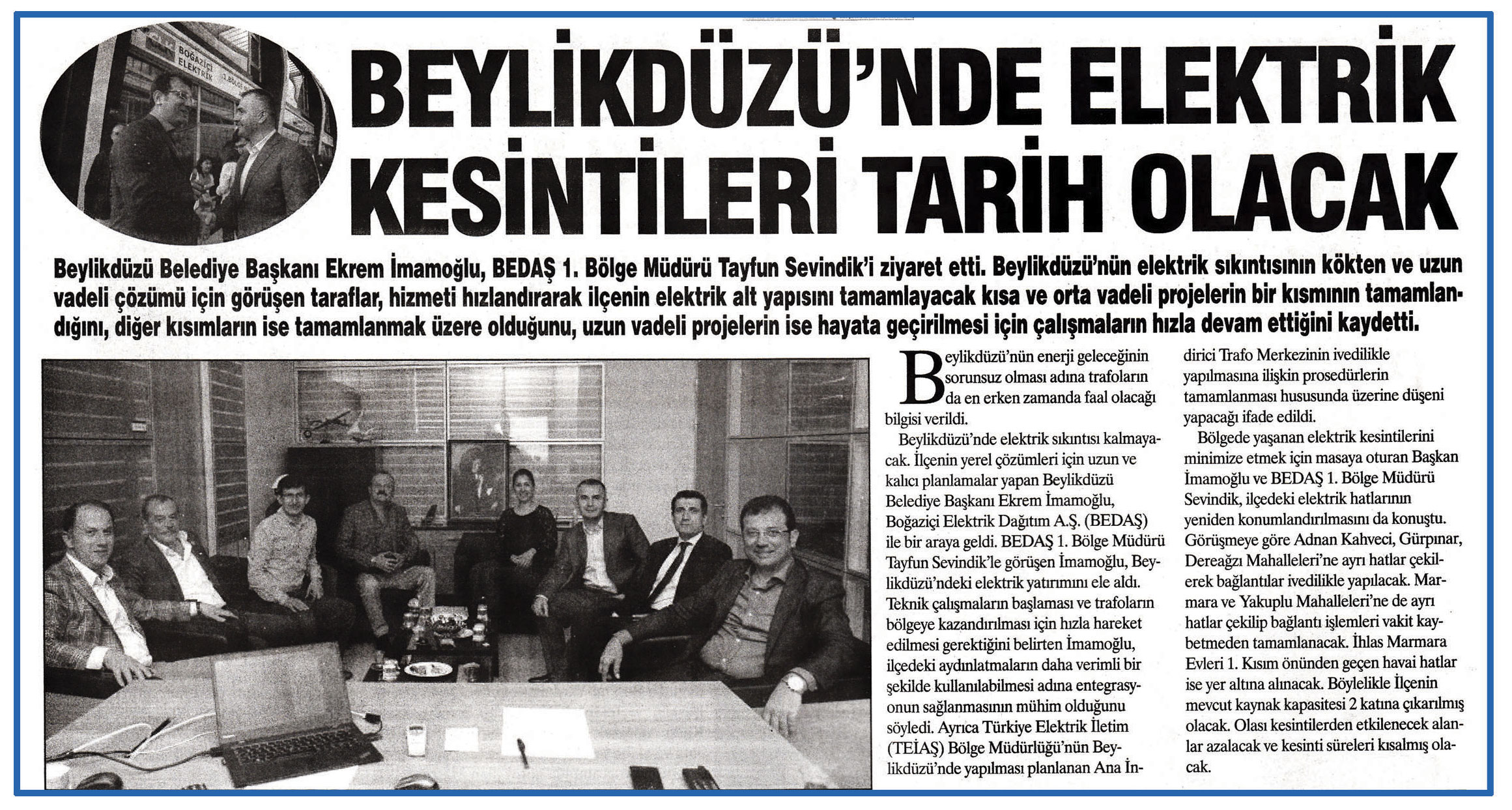 12 Haziran 2015 tarihli "YURT HABER" gazetesi. Beylikdüzü Belediye Başkanı Ekrem İmamoğlu, BEDAŞ 1. Bölge Müdürü Tayfun Sevindik'i ziyaret etti. Beylikdüzü'nünü Elektrik sıkıntısının kökten ve uzun vadeli çözümü için görüşen taraflar, hizmeti hızlandırarak ilçenin alt yapısını tamamlayacak kısa ve orta vadeli projelerin bir kısmının tamamlandığını, diğer kısımların ise tamamlanmak üzere olduğunu, uzun vadeli projelerin ise hayata geçirilmesi için çalışmaların hızla devam ettiğini kaydetti.