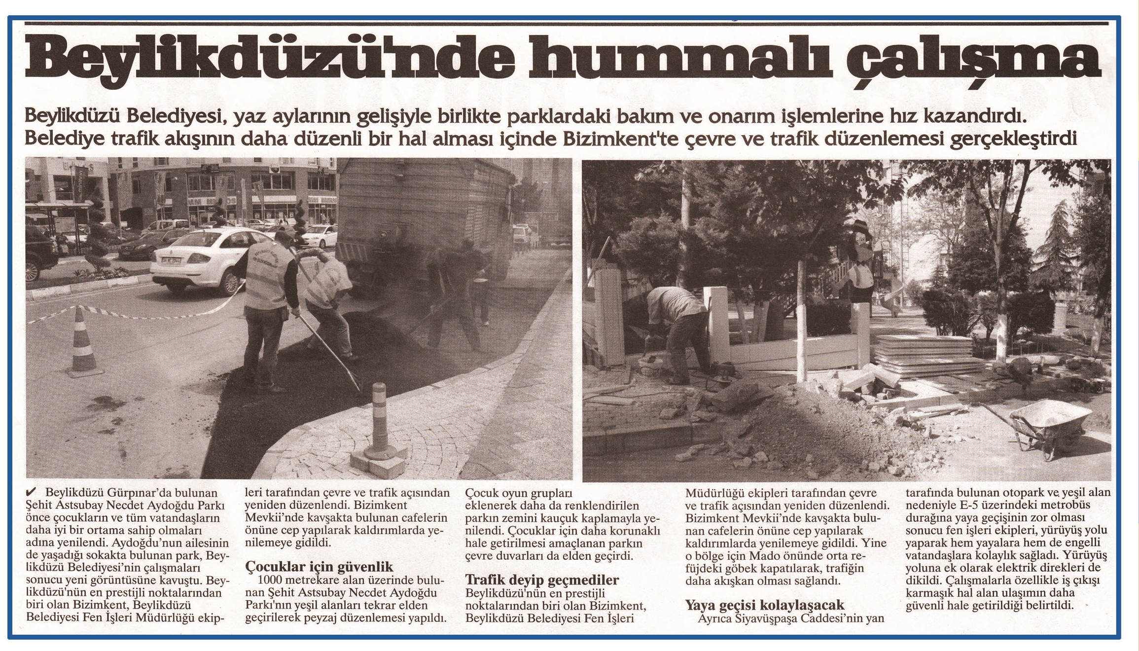 11 Mayıs 2015 tarihli ''ANAHABER'' gazetesi. Beylikdüzü Belediyesi,yaz aylarının gelişiyle birlikte parklardaki bakım ve onarım işlemlerine hız kazandırdı. Belediye trafik akışının daha düzenli bir hal alması içinde Bizimkent'te çevre ve trafik düzenlemesi gerçekleştirdi.