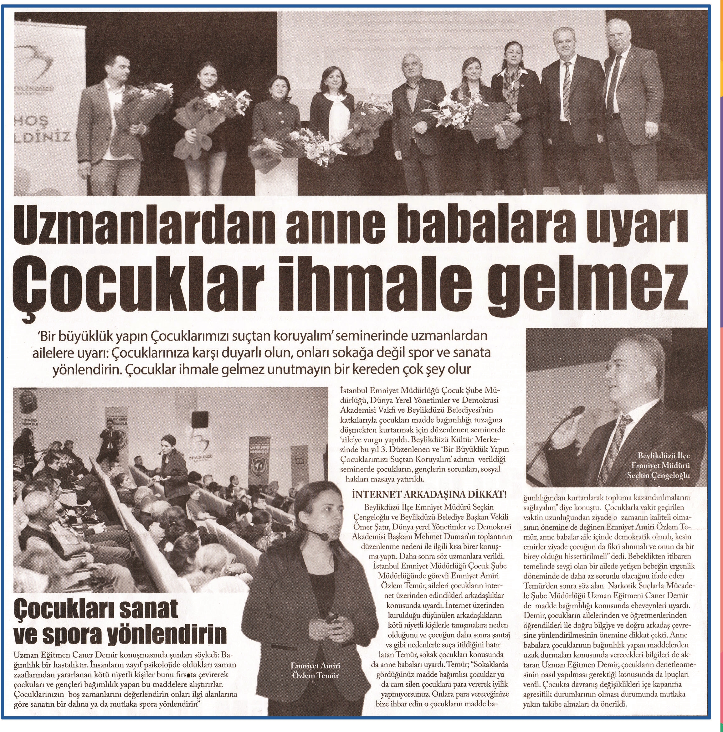 11 Mayıs 2015 tarihli ''BÜYÜK TAKİP'' gazetesi. İstanbul Emniyet Müdürlüğü Çocuk Şube Müdürlüğü,Dünya Yerel Yönetimler ve Demokrasi Akademisi Vakfı ve Beylikdüzü Belediyesi'nin katkılarıyla çocukları madde bağımlılığı tuzağına düşmekten kurtarmak için düzenlenen seminerde 'aile'ye vurgu yapıldı. Beylikdüzü Kültür Merkezinde bu yıl 3. Düzenlenen ve 'Bir Büyüklük Yapın Çocuklarımızı Suçtan Koruyalım' adının verildiği seminerde çocukların, gençlerin sorunları,sosyal hakları masaya yatırıldı.