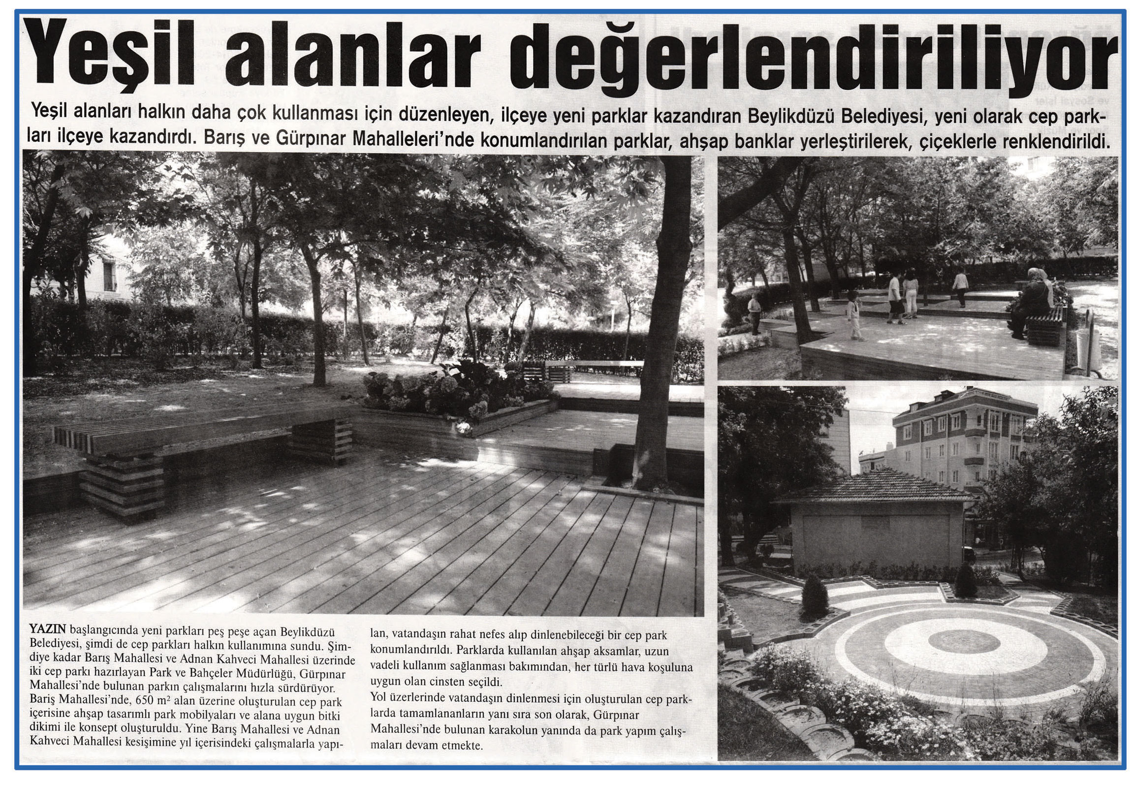 15 Haziran 2015 tarihli "MARMARA" gazetesi. Yeşil alanları halkın daha çok kullanması için düzenleyen, ilçeye yeni parklar kazandıran Beylikdüzü Belediyesi, yeni olarak cep parkları ilçeye kazandırdı. Barış ve Gürpınar Mahalleri'nde konumlandırılan parklar, ahşap banklar yerleştirilerek, çiçeklerle renklendirildi.